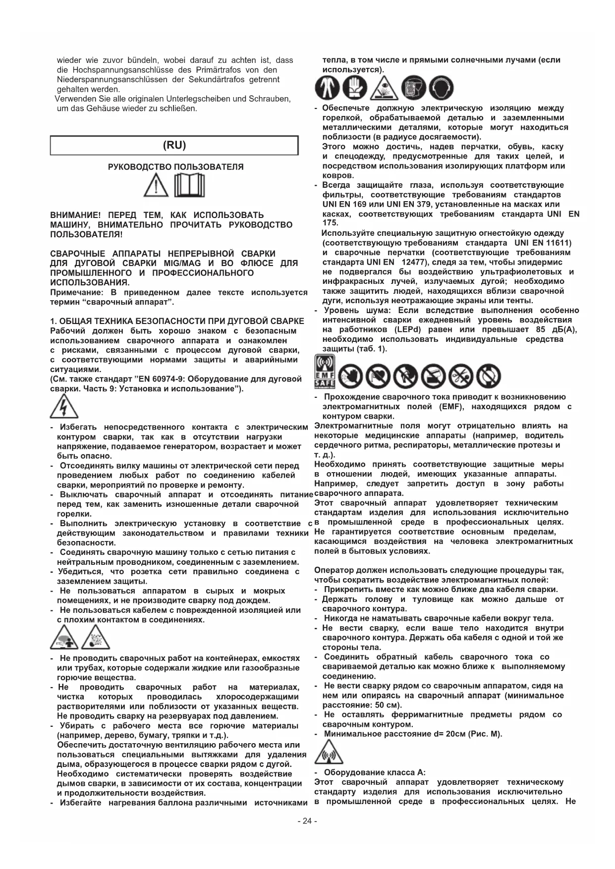 Необходимо принять соответствующие защитные меры в отношении людей, имеющих указанные аппараты. Например, следует запретить доступ в зону работы сварочногоаппарата. Этот сварочный аппарат удовлетворяет техническим стандартам изделия для использования исключительно в промышленной среде в профессиональных целях. Не гарантируется соответствие основным пределам, касающимся воздействия на человека электромагнитных полейвбытовыхусловиях. Оператордолжениспользоватьследующиепроцедурытак, чтобысократитьвоздействиеэлектромагнитныхполей: - Прикрепитьвместекакможноближедвакабелясварки. - Держать голову и туловище как можно дальше от сварочногоконтура. - Никогданенаматыватьсварочныекабеливокругтела. - Не вести сварку, если ваше тело находится внутри сварочногоконтура.Держатьобакабелясоднойитойже сторонытела. - Соединить обратный кабель сварочного тока со свариваемойдетальюкакможноближек выполняемому соединению. - Невестисваркурядомсосварочнымаппаратом,сидяна нем или опираясь на сварочный аппарат (минимальное расстояние:50см). - Не оставлять ферримагнитные предметы рядом со сварочнымконтуром. - Минимальноерасстояниеd=20см(Рис.M). - ОборудованиеклассаА: Этот сварочный аппарат удовлетворяет техническому стандарту изделия для использования исключительно в промышленной среде в профессиональных целях. Не- 25 - гарантируетсясоответствиетребованиямэлектромагнитной совместимости в бытовых помещениях и в помещениях, прямо соединенных с электросетью низкого напряжения, подающейпитаниевбытовыепомещения. ДОПОЛНИТЕЛЬНЫЕПРЕДОСТОРОЖНОСТИ - ОПЕРАЦИИСВАРКИ: - впомещениисвысокимрискомэлектрическогоразряда - впограничныхзонах - приналичиивозгораемыхивзрывчатыхматериалов. НЕОБХОДИМО, чтобы “ответственный эксперт” предварительно оценил риск и работы должны проводиться в присутствии других лиц, умеющих действоватьвситуациитревоги. НЕОБХОДИМО использовать технические средства защиты,описанныевразделах7.10;A.8;A.10стандарта ”EN60974-9:Оборудованиедлядуговойсварки.Часть9: Установкаииспользование”. - НЕОБХОДИМОзапретитьсварку,когдасварочныйаппарат или подающее устройство проволоки поддерживаются рабочим(наприм.,посредствомремней). - НЕОБХОДИМОзапретитьсварку,когдарабочийприподнят надполом,заисключениемслучаев,когдаиспользуются платформыбезопасности. - НАПРЯЖЕНИЕ МЕЖДУ ДЕРЖАТЕЛЯМИ ЭЛЕКТРОДОВ ИЛИ ГОРЕЛКАМИ: работая с несколькими сварочными аппаратами на одной детали или на соединенных электрически деталях возможна генерация опасной суммы“холостого”напряжениямеждудвумяразличными держателями электродов или горелками, до значения, могущеговдваразапревыситьдопустимыйпредел. Квалифицированномуспециалистунеобходимопоручить приборное измерение для выявления рисков и выбора подходящих средств защиты согласно разделу 7.9. стандарта”EN60974-9:Оборудованиедлядуговойсварки. Часть9:Установкаииспользование”. ÎСТАТОЧНЫЙРИСК - ОПРОКИДЫВАНИЕ: расположить сварочный аппарат на горизонтальной поверхности несущей способности, соответствующеймассе;впротивномслучае(напр.,пол под наклоном, неровный и т. д..) существует опасность опрокидывания. - ПРИМЕНЕНИЕ НЕ ПО НАЗНАЧЕНИЮ: опасно применять сварочный аппарат для любых работ, отличающихся от предусмотренных (напр. Размораживание труб водопроводнойсети). - ПЕРЕМЕ