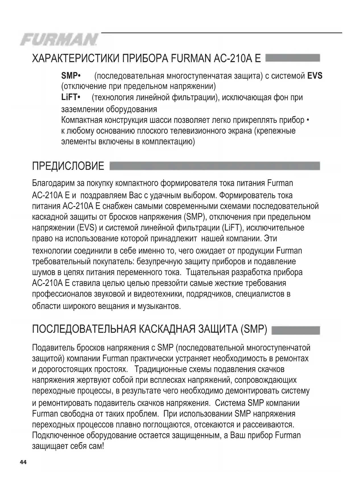 SMP• (последовательная многоступенчатая защита) с системойEVS (отключение при предельном напряжении) LiFT• (технология линейной фильтрации), исключающая фон при заземлении оборудования Компактная конструкция шасси позволяет легко прикреплять прибор • к любому основанию плоского телевизионного экрана (крепежные элементы включены в комплектацию) ПРЕДИСЛОВИЕ Благодарим за покупку компактного формирователя тока питания Furman AC-210A E и поздравляем Вас с удачным выбором. Формирователь тока питания AC-210A E снабжен самыми современными схемами последовательной каскадной защиты от бросков напряжения (SMP), отключения при предельном напряжении (EVS) и системой линейной фильтрации (LiFT), исключительное право на использование которой принадлежит нашей компании. Эти технологии соединили в себе именно то, чего ожидает от продукции Furman требовательный покупатель: безупречную защиту приборов и подавление шумов в цепях питания переменного тока. Тщательная разработка прибора AC-210A E ставила целью целью превзойти самые жесткие требования профессионалов звуковой и видеотехники, подрядчиков, специалистов в области широкого вещания и музыкантов. ПОСЛЕДОВАТЕЛЬНАЯ КАСКАДНАЯ ЗАЩИТА (SMP) Подавитель бросков напряжения с SMP (последовательной многоступенчатой защитой) компании Furman практически устраняет необходимость в ремонтах и дорогостоящих простоях. Традиционные схемы подавления скачков напряжения жертвуют собой при всплесках напряжений, сопровождающих переходные процессы, в результате чего необходимо демонтировать систему и ремонтировать подавитель скачков напряжения. Система SMP компании Furman свободна от таких проблем. При использовании SMP напряжения переходных процессов плавно поглощаются, отсекаются и рассеиваются. Подключенное оборудование остается защищенным, а Ваш прибор Furman защищает себя сам!FRANÇAIS ENGLISH ESpAÑoL