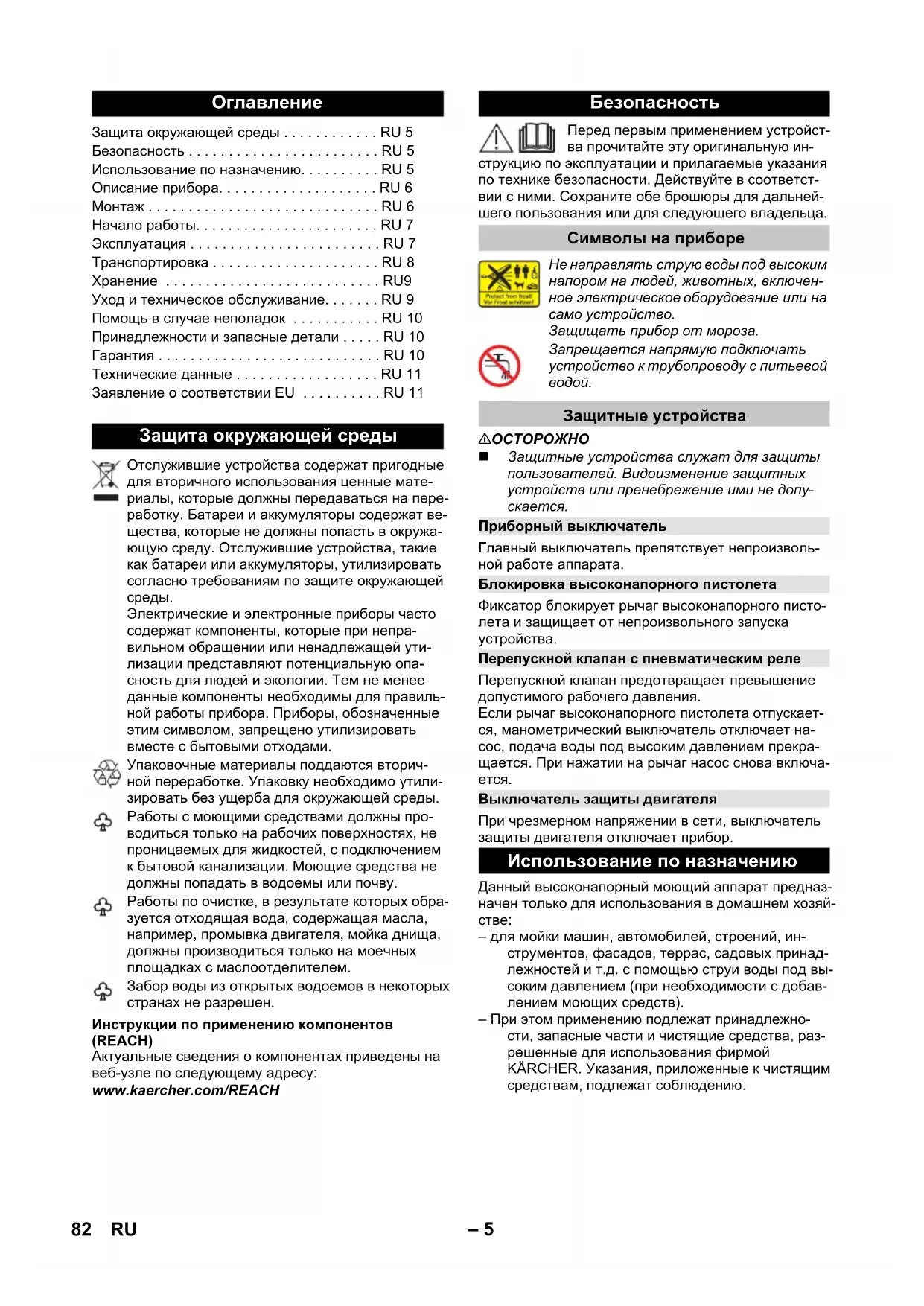 Защитные устройства Приборный выключатель Блокировка высоконапорного пистолета Перепускной клапан с пневматическим реле Выключатель защиты двигателя Использование по назначению 82 RU– 6 Комплектация устройства (в зависимости от моде- ли) указана на упаковке. В данной инструкции по эк- сплуатации содержится описание всех возможных