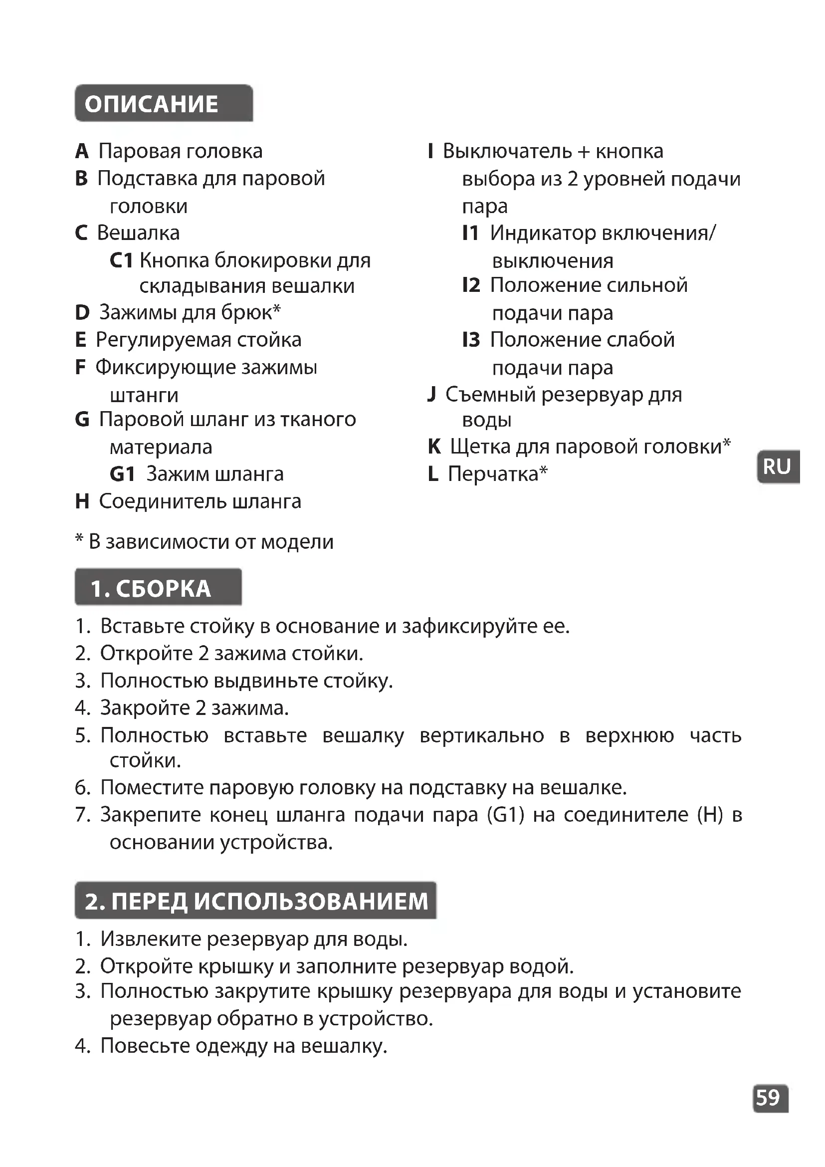 C Вешалка C1 Кнопка блокировки для складывания вешалки D Зажимы для брюк* E Регулируемая стойка F Фиксирующие зажимы