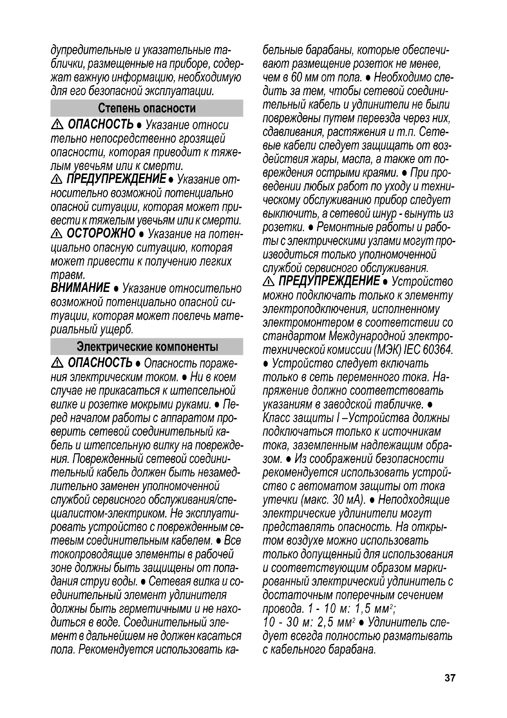 ● Удлинитель сле- дует всегда полностью разматывать с кабельного барабана. Степень опасности Электрические компоненты38