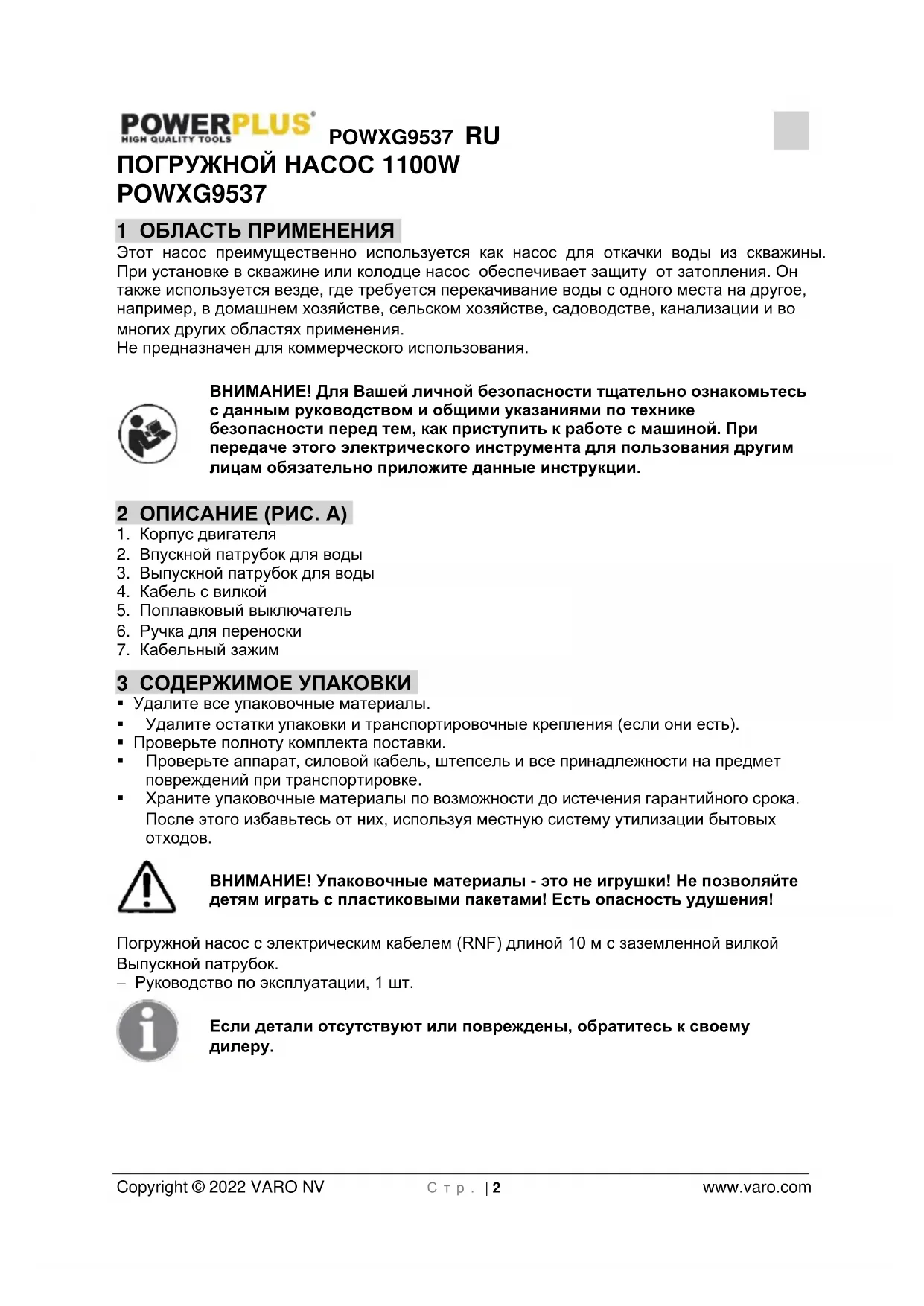 - 16 ДЕКЛАРАЦИЯ СООТВЕТСТВИЯ POWXG9537 RU Copyright © 2022 VARO NV С т р . | 2 www.varo.com ПОГРУЖНОЙ НАСОС 1100W POWXG9537 1 ОБЛАСТЬ ПРИМЕНЕНИЯ Этот насос преимущественно используется как насос для откачки воды из скважины. При установке в скважине или колодце насос обеспечивает защиту от затопления. Он также используется везде, где требуется перекачивание воды с одного места на другое, например, в домашнем хозяйстве, сельском хозяйстве, садоводстве, канализации и во многих других областях применения. Не предназначен для коммерческого использования. ВНИМАНИЕ! Для Вашей личной безопасности тщательно ознакомьтесь с данным руководством и общими указаниями по технике безопасности перед тем, как приступить к работе с машиной. При передаче этого электрического инструмента для пользования другим лицам обязательно приложите данные инструкции. 2 ОПИСАНИЕ (РИС. A) p. 8