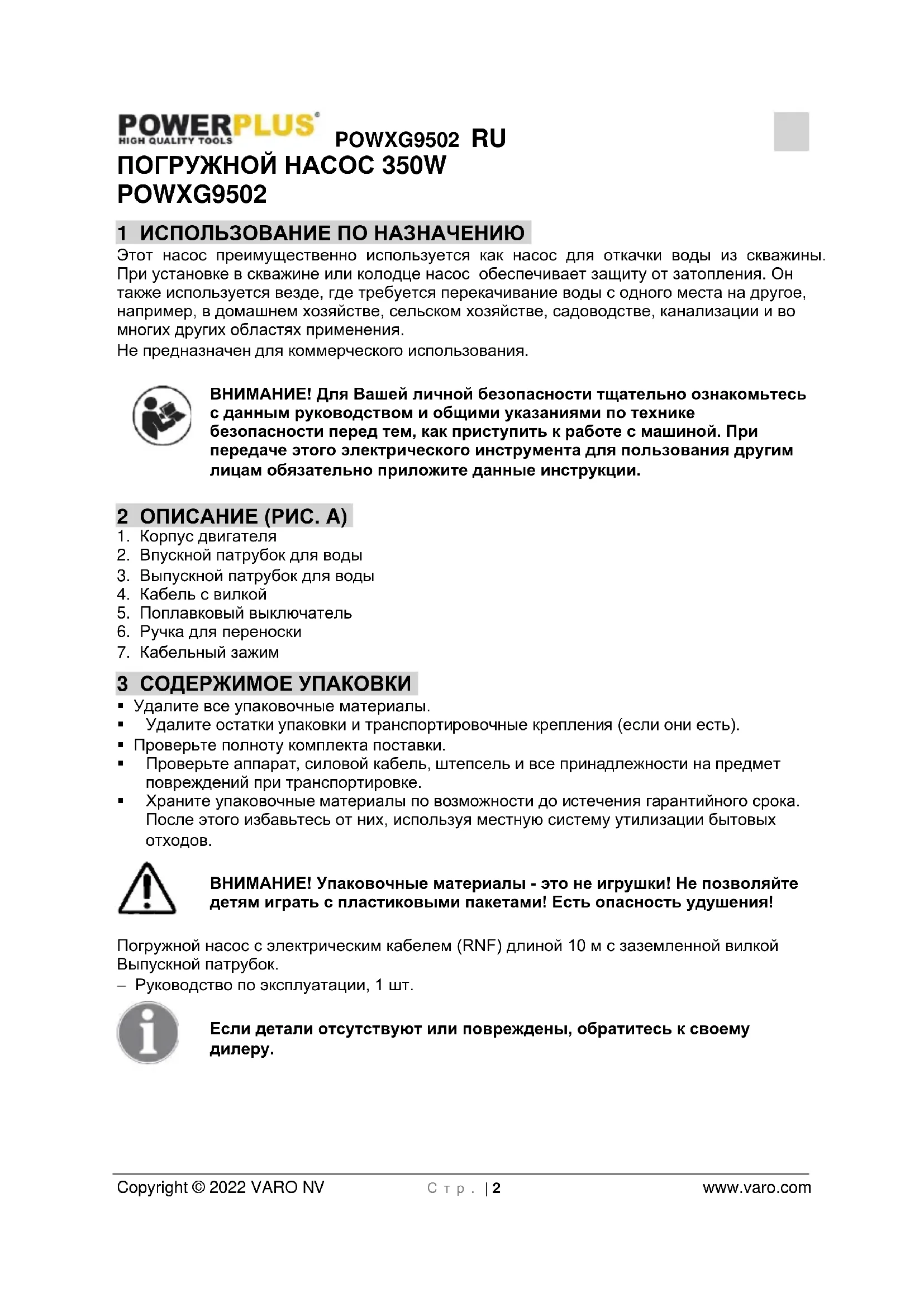 - 16 ДЕКЛАРАЦИЯ СООТВЕТСТВИЯ POWXG9502 RU Copyright © 2022 VARO NV С т р . | 2 www.varo.com ПОГРУЖНОЙ НАСОС 350W POWXG9502 1 ИСПОЛЬЗОВАНИЕ ПО НАЗНАЧЕНИЮ Этот насос преимущественно используется как насос для откачки воды из скважины. При установке в скважине или колодце насос обеспечивает защиту от затопления. Он также используется везде, где требуется перекачивание воды с одного места на другое, например, в домашнем хозяйстве, сельском хозяйстве, садоводстве, канализации и во многих других областях применения. Не предназначен для коммерческого использования. ВНИМАНИЕ! Для Вашей личной безопасности тщательно ознакомьтесь с данным руководством и общими указаниями по технике безопасности перед тем, как приступить к работе с машиной. При передаче этого электрического инструмента для пользования другим лицам обязательно приложите данные инструкции. 2 ОПИСАНИЕ (РИС. A) p. 8