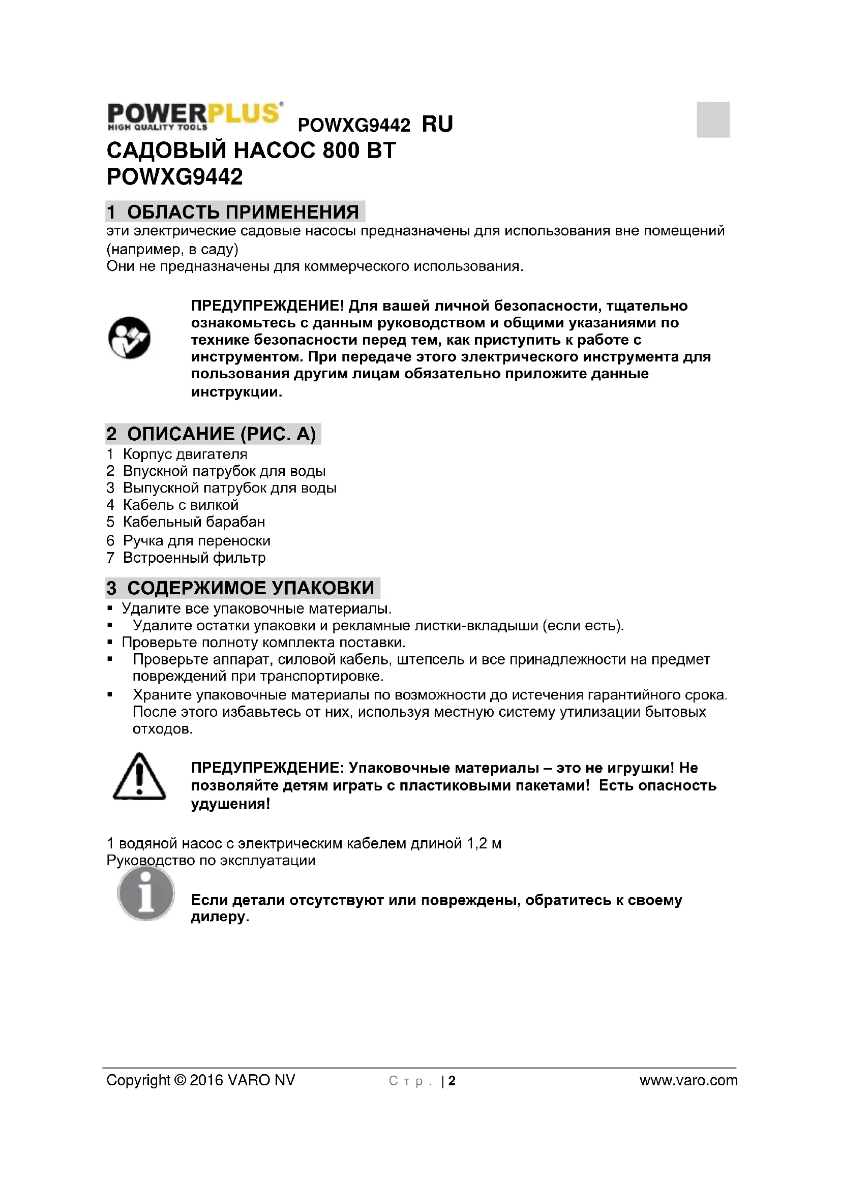 - 14 ДЕКЛАРАЦИЯ О СООТВЕТСТВИИ POWXG9442 RU Copyright © 2016 VARO NV С т р . | 2 www.varo.com САДОВЫЙ НАСОС 800 ВТ POWXG9442 1 ОБЛАСТЬ ПРИМЕНЕНИЯ эти электрические садовые насосы предназначены для использования вне помещений (например, в саду) Они не предназначены для коммерческого использования. ПРЕДУПРЕЖДЕНИЕ! Для вашей личной безопасности, тщательно ознакомьтесь с данным руководством и общими указаниями по технике безопасности перед тем, как приступить к работе с инструментом. При передаче этого электрического инструмента для пользования другим лицам обязательно приложите данные инструкции. 2 ОПИСАНИЕ (РИС. A) 1 Корпус двигателя 2 Впускной патрубок для воды 3 Выпускной патрубок для воды 4 Кабель с вилкой 5 Кабельный барабан 6 Ручка для переноски 7 Встроенный фильтр 3 СОДЕРЖИМОЕ УПАКОВКИ Удалите все упаковочные материалы. Удалите остатки упаковки и рекламные листки-вкладыши (если есть). Проверьте полноту комплекта поставки. Проверьте аппарат, силовой кабель, штепсель и все принадлежности на предмет повреждений при транспортировке. Храните упаковочные материалы по возможности до истечения гарантийного срока. После этого избавьтесь от них, используя местную систему утилизации бытовых p. 10
