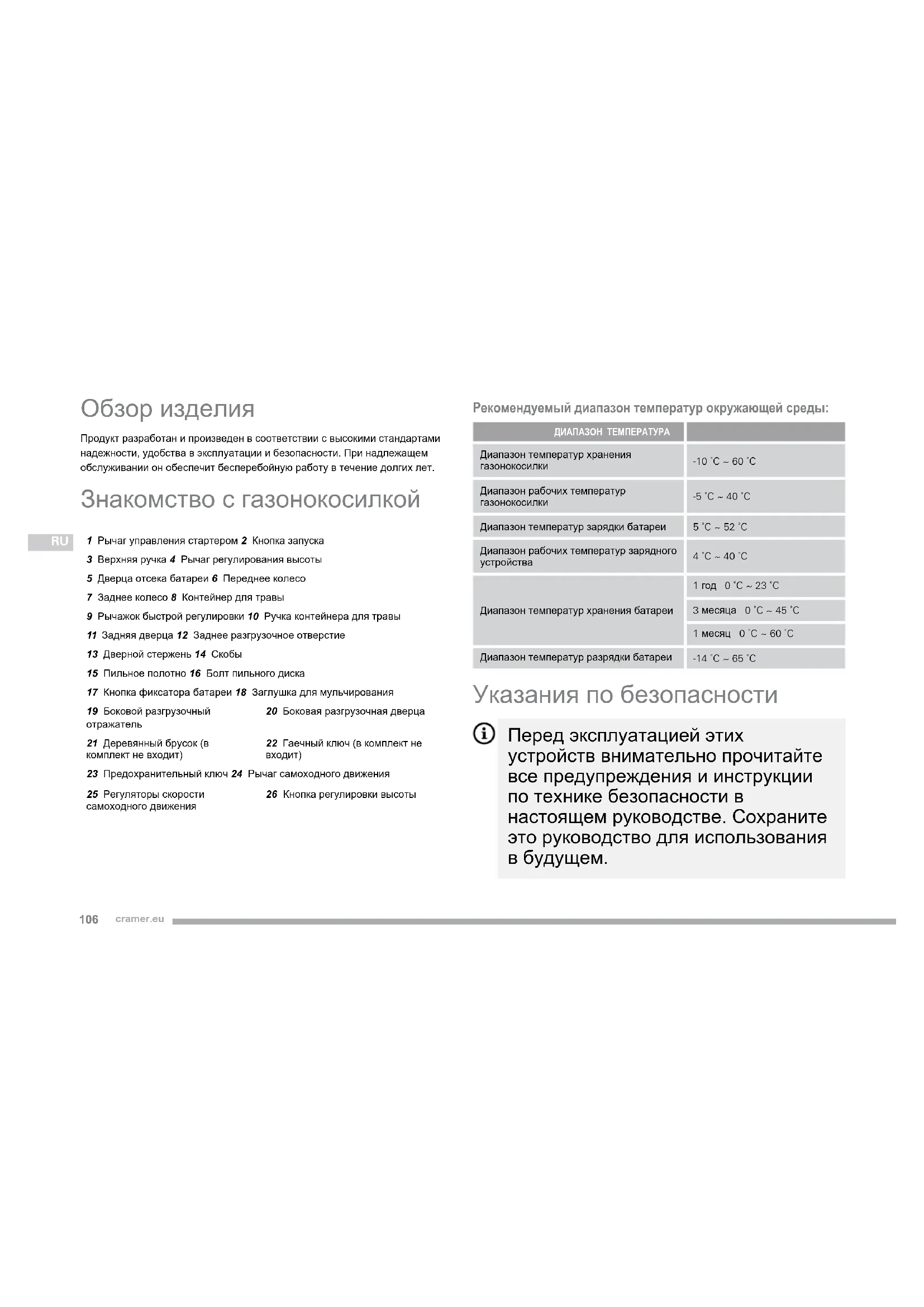 Обзор изделия Продукт разработан и произведен в соответствии с высокими стандартами надежности, удобства в эксплуатации и безопасности. При надлежащем обслуживании он обеспечит бесперебойную работу в течение долгих лет. Знакомство с газонокосилкой 1 Рычаг управления стартером 2 Кнопка запуска3 Верхняя ручка 4 Рычаг регулирования высоты5 Дверца отсека батареи 6 Переднее колесо7 Заднее колесо 8 Контейнер для травы9 Рычажок быстрой регулировки 10 Ручка контейнера для травы11 Задняя дверца 12 Заднее разгрузочное отверстие13 Дверной стержень 14 Скобы15 Пильное полотно 16 Болт пильного диска17 Кнопка фиксатора батареи 18 Заглушка для мульчирования19 Боковой разгрузочный отражатель20 Боковая разгрузочная дверца21 Деревянный брусок (в комплект не входит)22 Гаечный ключ (в комплект не входит)23 Предохранительный ключ 24 Рычаг самоходного движения 25 Регуляторы скорости самоходного движения26 Кнопка регулировки высоты Рекомендуемый диапазон температур окружающей среды: ДИАПАЗОН ТЕМПЕРАТУРА Диапазон температур хранения газонокосилки-10 ˚C ~ 60 ˚C Диапазон рабочих температур газонокосилки-5 ˚C ~ 40 ˚C Диапазон температур зарядки батареи 5 ˚C ~ 52 ˚C Диапазон рабочих температур зарядного устройства 4 ˚C ~ 40 ˚C Диапазон температур хранения батареи 1 год 0 ˚C ~ 23 ˚C 3 месяца 0 ˚C ~ 45 ˚C 1 месяц 0 ˚C ~ 60 ˚CДиапазон температур разрядки батареи -14 ˚C ~ 65 ˚C Указания по безопасности Перед эксплуатацией этих устройств внимательно прочитайте все предупреждения и инструкции по технике безопасности в настоящем руководстве. Сохраните это руководство для использования в будущем.107 cramer.eu