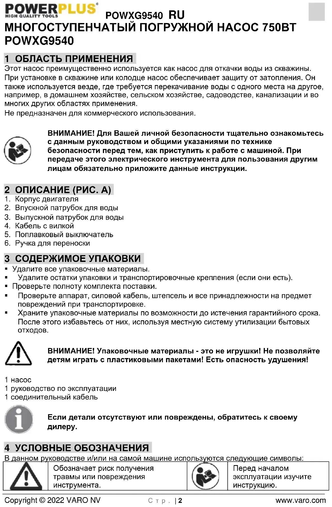 - или гибким трубопроводом. Он должен быть закреплен с помощью предусмотренной для этого ручки или установлен на дне отстойника (оно должно быть чистым, без загрязнений или осадка)POWXG9540 RU Copyright © 2022 VARO NV С т р . | 4 www.varo.com Если уровень воды низкий (длительный период засухи), внимательно следите за тем, чтобы любые загрязнения или осадок после высыхания не препятствовали запуску насоса. Следовательно, необходимо следить за чистотой места установки насоса и периодически запускать насос. Насос всегда должен использоваться в вертикальном положении (ручка сверху). Рекомендуется закрепить насос, прикрепив трос (или аналогичный предмет) к ручке, а другой конец − к легкодоступному статическому объекту. 8 ЭЛЕКТРОПИТАНИЕ Перед запуском насоса убедитесь, что: