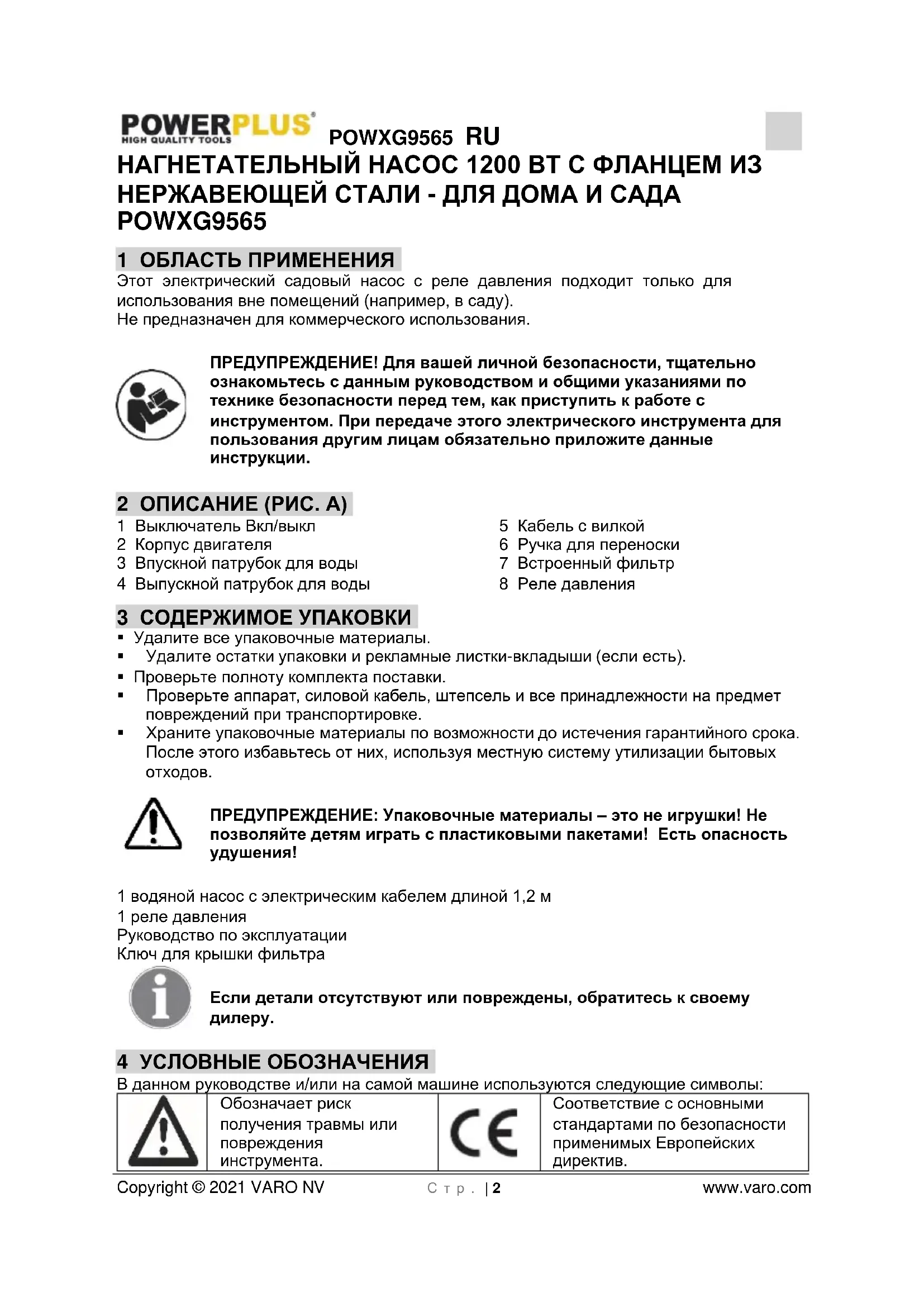 - 14 ДЕКЛАРАЦИЯ О СООТВЕТСТВИИ POWXG9565 RU Copyright © 2021 VARO NV С т р . | 2 www.varo.com НАГНЕТАТЕЛЬНЫЙ НАСОС 1200 ВТ С ФЛАНЦЕМ ИЗ НЕРЖАВЕЮЩЕЙ СТАЛИ - ДЛЯ ДОМА И САДА POWXG9565 1 ОБЛАСТЬ ПРИМЕНЕНИЯ Этот электрический садовый насос с реле давления подходит только для использования вне помещений (например, в саду). Не предназначен для коммерческого использования. ПРЕДУПРЕЖДЕНИЕ! Для вашей личной безопасности, тщательно ознакомьтесь с данным руководством и общими указаниями по технике безопасности перед тем, как приступить к работе с инструментом. При передаче этого электрического инструмента для пользования другим лицам обязательно приложите данные инструкции. 2 ОПИСАНИЕ (РИС. A) 1 Выключатель Вкл/выкл 2 Корпус двигателя 3 Впускной патрубок для воды 4 Выпускной патрубок для воды 5 Кабель c вилкой 6 Ручка для переноски 7 Встроенный фильтр 8 Реле давления 3 СОДЕРЖИМОЕ УПАКОВКИ p. 9