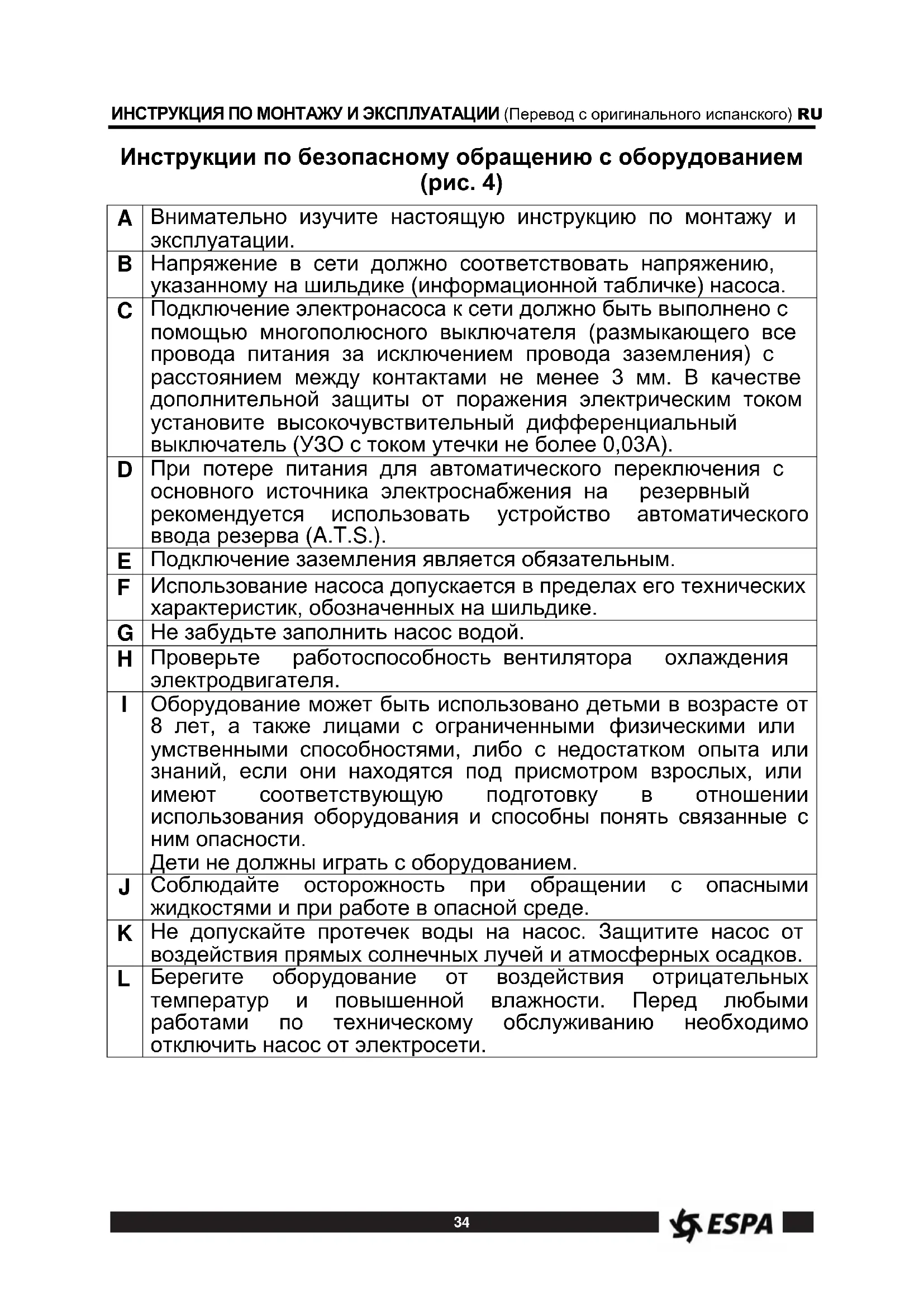 Пожалуйста, изучите настоящую инструкцию в целях лучшего использования насоса и его безопасной эксплуатации. MULTI – серия вертикальных центробежных многоступенчатых насосов, предназначенных для перекачивания чистой воды температурой не более 40°С. Эти насосы изготавливаются из высококачественных материалов. Их гидравлическая и электрическая части подвергаются строгому контролю и проверке. Прочитайте данную инструкцию и строго следуйте указаниям по установке и использованию насоса. Обратите внимание на схемы электрических подключений. Несоблюдение правил может привести к перегрузке двигателя или другим повреждениям, за которые изготовитель оборудования ответственности не несет. Индекс минимальной эффективности В соответствии с Регламентом ЕС 547/2012 с 01/01/2015г. индекс минимальной эффективности должен составлять: MEI ≥ 0,4. Для наиболее эффективных водяных насосов устанавливается индекс MEI ≥ 0,70. Кривые производительности и характеристики эффективности указаны в технических каталогах и на сайте www.espa.com. Эффективность насоса с уменьшенным диаметром рабочего колеса ниже, чем у насоса с полным диаметром. Уменьшение диаметра рабочего колеса приводит к меньшему потреблению энергии, но и к меньшим гидравлическим характеристикам. Индекс минимальной эффективности (MEI) основывается на характеристиках рабочего колеса с полным диаметром. Работа такого насоса с переменными рабочими характеристиками может иметь значительно более высокую эффективность и экономичность при условии использования, например, привода частотного регулирования, который контролирует работу насоса на основе показаний датчика давления. Информация о контрольных значениях эффективности: http://global.espa.com/doc-descarrega-1/fingerprints.pdf