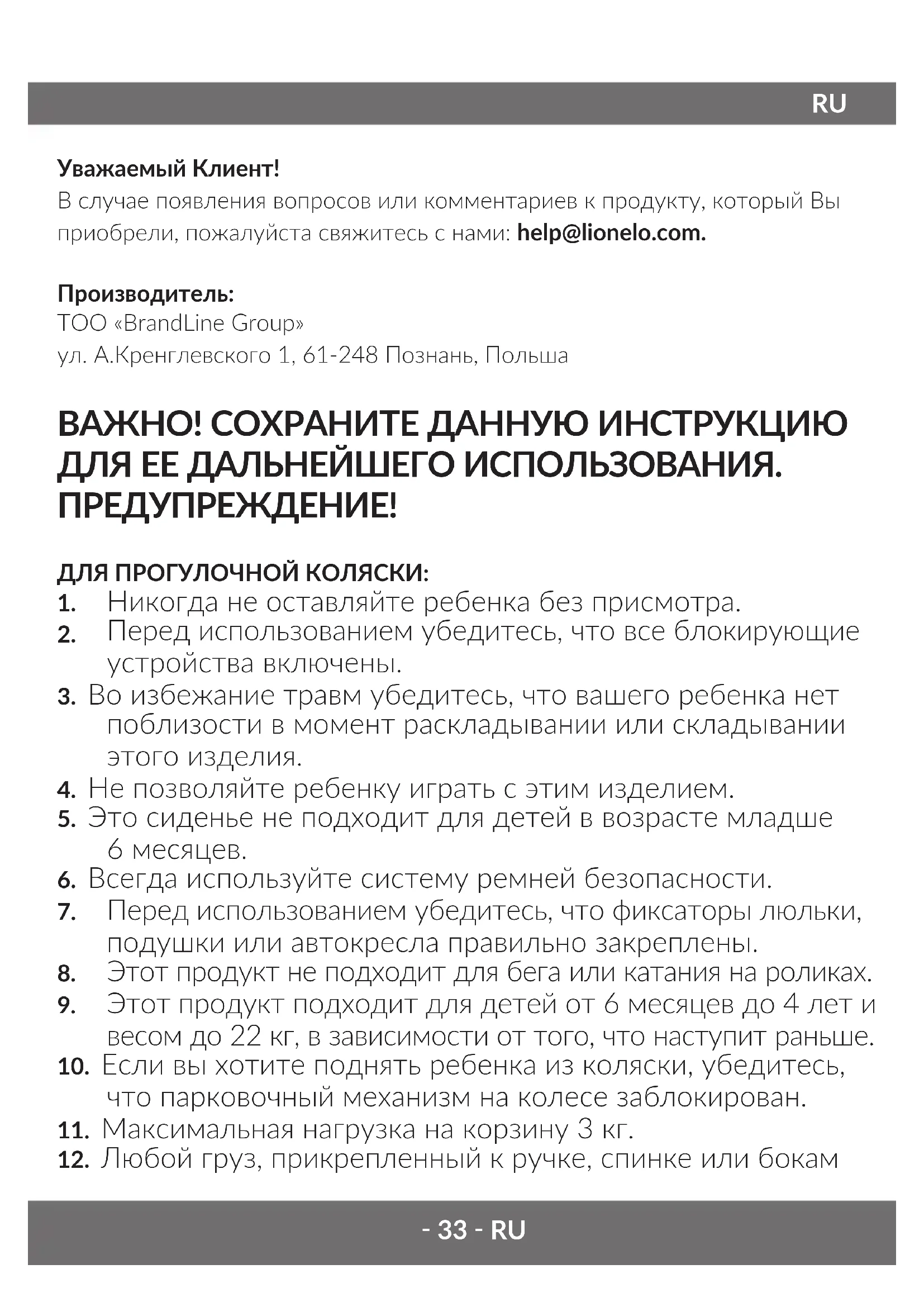 Уважаемый Клиент! В случае появления вопросов или комментариев к продукту, который Вы приобрели, пожалуйста свяжитесь с нами: help@lionelo.com. Производитель: ТОО «BrandLine Group» ул. А.Кренглевского 1, 61-248 Познань, Польша ВАЖНО! СОХРАНИТЕ ДАННУЮ ИНСТРУКЦИЮ ДЛЯ ЕЕ ДАЛЬНЕЙШЕГО ИСПОЛЬЗОВАНИЯ. ПРЕДУПРЕЖДЕНИЕ! ДЛЯ ПРОГУЛОЧНОЙ КОЛЯСКИ: