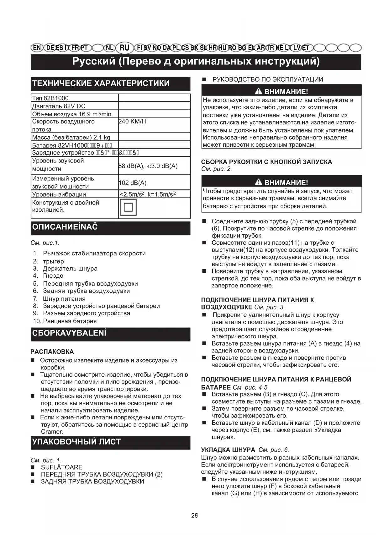 5. Передняя трубка воздуходувки6. Задняя трубка воздуходувки7. Шнур питания8. Зарядное устройство ранцевой батареи9. Разъем зарядного устройства10. Ранцевая батарея СБОРКАVYBALENÍ Осторожно извлеките изделие и аксессуары из Тщательно осмотрите изделие, чтобы убедиться в отсутствии поломки и липо вреждения , произо-шедшего во время транспортировки. Не выбрасывайте упаковочный материал до тех пор, пока вы внимательно не осмотрели и не начали эксплуатировать изделие. Если к акие-либо детали повреждены или отсутс- твуют, обратитесь за помощью в сервисный центр Cramer. УПАКОВОЧНЫЙ ЛИСТ См. рис. 1. SUFLĂTOARE ПЕРЕДНЯЯ ТРУБКА ВОЗДУХОДУВКИ (2) ЗАДНЯЯ ТРУБКА ВОЗДУХОДУВКИ РУКОВОДСТВО ПО ЭКСПЛУАТАЦИИ Не используйте это изделие, если вы обнаружите вупаковке, что какие-либо детали из комплектапоставки уже установлены на изделие. Детали изэтого списка не устанавливаются на изделие изгото-вителем и должны быть установлены пок упателем. Использование неправильно собранного изделия может привести к серьезным травмам.СБОРКА РУКОЯТКИ С КНОПКОЙ ЗАПУСКАСм. рис. 2. Чтобы предотвратить случайный запуск, что можетпривести к серьезным травмам, всегда снимайтебатарею с устройства при сборке деталей. Соедините заднюю трубку (5) с передней трубкой (6). Прокрутите по часовой стрелке до положения фиксации трубок. Совместите один из пазов(11) на трубке с выступами(12) на корпусе воздуходувки. Толкайте трубку на корпус воздуходувки до тех пор, пока выступы не войдут в зацепление с пазами. Поверните трубку в направлении, указанном стрелкой, до тех пор, пока оба выступа не войдут в запертое положение. ПОДКЛЮЧЕНИЕ ШНУРА ПИТАНИЯ К ВОЗДУХОДУВКЕ См. рис. 3. Прикрепите удлинительный шнур к корпусу двигателя с помощью держателя шнура. Это предотвращает случайное отсоединение электрического шнура. Вставьте разъем шнура питания (А) в гнездо (4) на задней стороне воздуходувки. Вставьте разъем в гнездо и поверните против часовой стрелки, чтобы зафиксировать его. ПОДКЛЮЧЕНИЕ ШНУРА ПИТАНИЯ К РАНЦЕВОЙ БАТАРЕЕ См. рис. 4-5. Вставьте разъем (B) в гнездо (C). Для этого совместите выступы на разъеме с пазами в гнезде. Затем поверните разъем по часовой стрелке, чтобы зафиксировать его. Вставьте шнур в кабельный канал (D) и проложите через корпус (E), см. также раздел «Укладка шнура». УКЛАДКА ШНУРА См. рис. 6. Шнур можно разместить в разных кабельных каналах. Если электроинструмент используется с батареей, следуйте указанным ниже инструкциям. В случае использования рядом с телом или позади него уложите шнур (F) в боковой кабельный канал (G) или (H) в зависимости от используемого 29Русский (Перево д оригинальных инструкций)