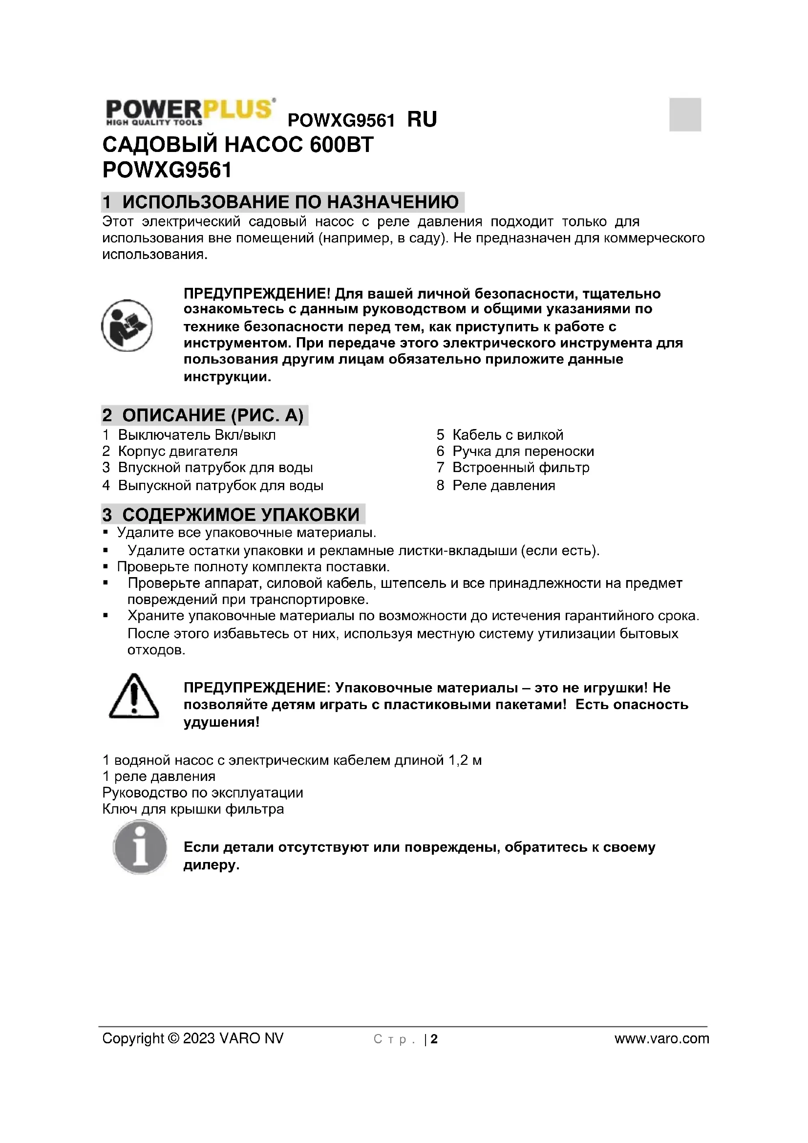 - 14 ДЕКЛАРАЦИЯ О СООТВЕТСТВИИ POWXG9561 RU Copyright © 2023 VARO NV С т р . | 2 www.varo.com САДОВЫЙ НАСОС 600ВТ POWXG9561 1 ИСПОЛЬЗОВАНИЕ ПО НАЗНАЧЕНИЮ Этот электрический садовый насос с реле давления подходит только для использования вне помещений (например, в саду). Не предназначен для коммерческого использования. ПРЕДУПРЕЖДЕНИЕ! Для вашей личной безопасности, тщательно ознакомьтесь с данным руководством и общими указаниями по технике безопасности перед тем, как приступить к работе с инструментом. При передаче этого электрического инструмента для пользования другим лицам обязательно приложите данные инструкции. 2 ОПИСАНИЕ (РИС. A) 1 Выключатель Вкл/выкл 2 Корпус двигателя 3 Впускной патрубок для воды 4 Выпускной патрубок для воды 5 Кабель c вилкой 6 Ручка для переноски 7 Встроенный фильтр 8 Реле давления 3 СОДЕРЖИМОЕ УПАКОВКИ p. 9