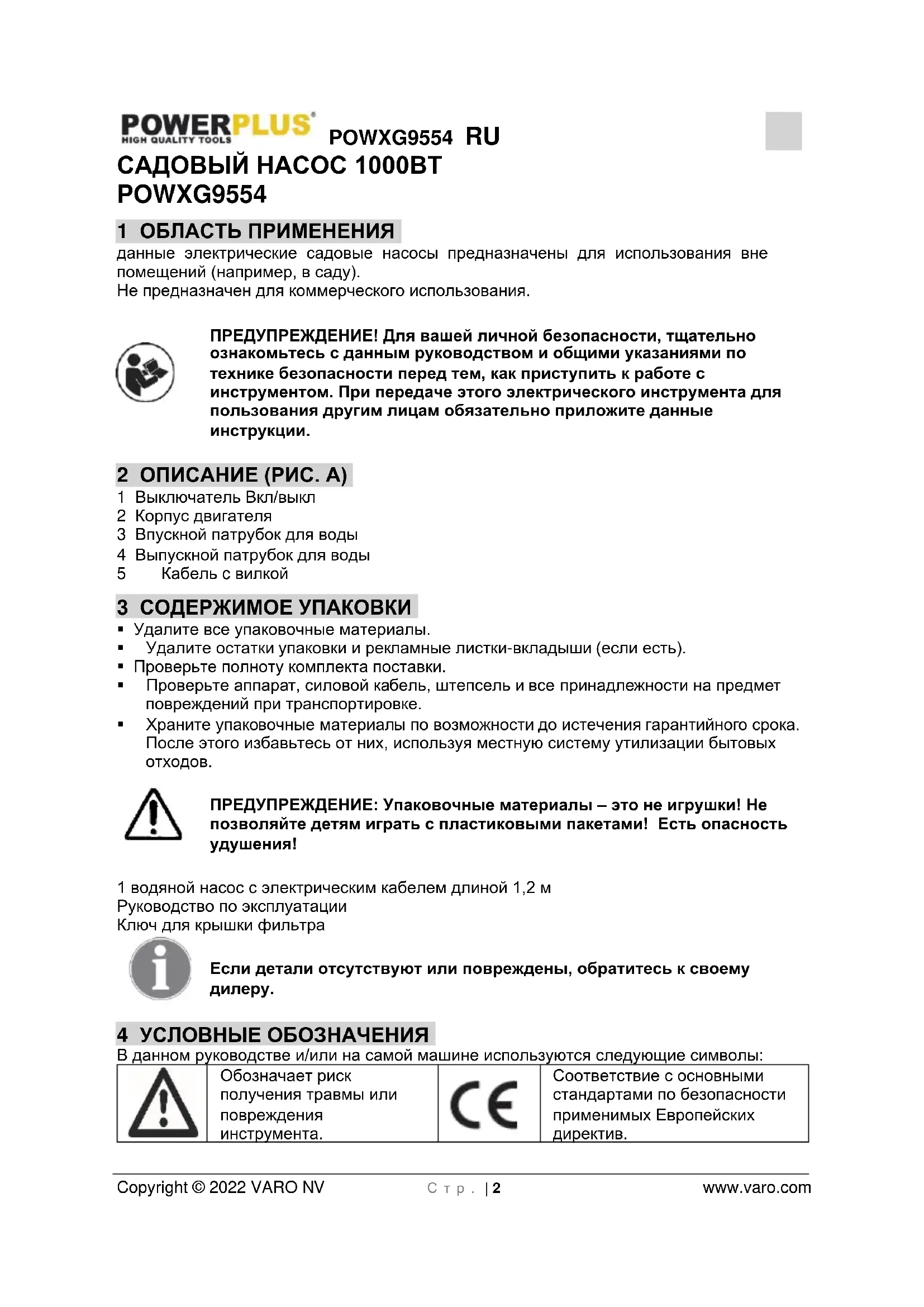 - 14 ДЕКЛАРАЦИЯ О СООТВЕТСТВИИ POWXG9554 RU Copyright © 2022 VARO NV С т р . | 2 www.varo.com САДОВЫЙ НАСОС 1000ВТ POWXG9554 1 ОБЛАСТЬ ПРИМЕНЕНИЯ данные электрические садовые насосы предназначены для использования вне помещений (например, в саду). Не предназначен для коммерческого использования. ПРЕДУПРЕЖДЕНИЕ! Для вашей личной безопасности, тщательно ознакомьтесь с данным руководством и общими указаниями по технике безопасности перед тем, как приступить к работе с инструментом. При передаче этого электрического инструмента для пользования другим лицам обязательно приложите данные инструкции. 2 ОПИСАНИЕ (РИС. A) 1 Выключатель Вкл/выкл 2 Корпус двигателя 3 Впускной патрубок для воды 4 Выпускной патрубок для воды 5 Кабель c вилкой 3 СОДЕРЖИМОЕ УПАКОВКИ p. 9