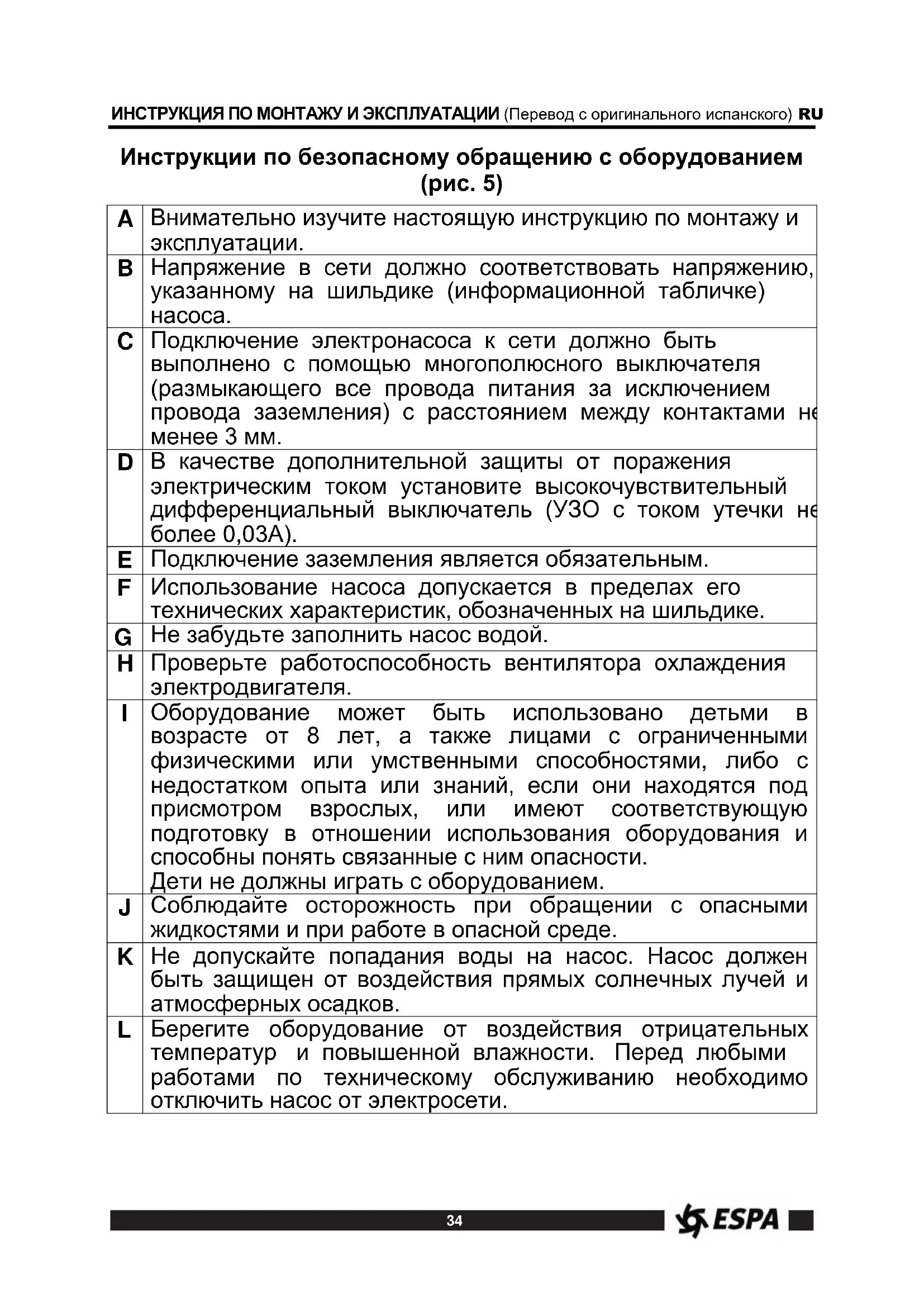 Пожалуйста, изучите настоящую инструкцию в целях правильного использования насоса и его безопасной эксплуатации. MULTI VE – серия вертикальных центробежных многоступенчатых насосов, предназначенных для перекачивания чистой воды с температурой не более 40°С. Эти насосы изготавливаются из высококачественных материалов. Их гидравлическая и электрическая части подвергаются строгому контролю и проверке. Прочитайте настоящую инструкцию и строго следуйте указаниям по установке и использованию насоса. Обратите внимание на схемы электрических подключений. Несоблюдение правил может привести к перегрузке электродвигателя или другим повреждениям, за которые изготовитель оборудования ответственности не несет. Индекс минимальной эффективности В соответствии с Регламентом ЕС 547/2012 с 01/01/2015г. индекс минимальной эффективности должен составлять: MEI ≥ 0,4. Для наиболее эффективных водяных насосов устанавливается индекс MEI ≥ 0,70. Кривые производительности и характеристики эффективности указаны в технических каталогах и на сайте www.espa.com. Эффективность насоса с уменьшенным диаметром рабочего колеса ниже, чем у насоса с полным диаметром. Уменьшение диаметра рабочего колеса приводит к меньшему потреблению энергии, но и к меньшим гидравлическим характеристикам. Индекс минимальной эффективности (MEI) основывается на характеристиках рабочего колеса с полным диаметром. Работа такого насоса с переменными рабочими характеристиками может иметь значительно более высокую эффективность и экономичность при условии использования, например, привода частотного регулирования, который контролирует работу насоса на основе показаний датчика давления. Информация о контрольных значениях эффективности: http://global.espa.com/doc-descarrega-1/fingerprints.pdf