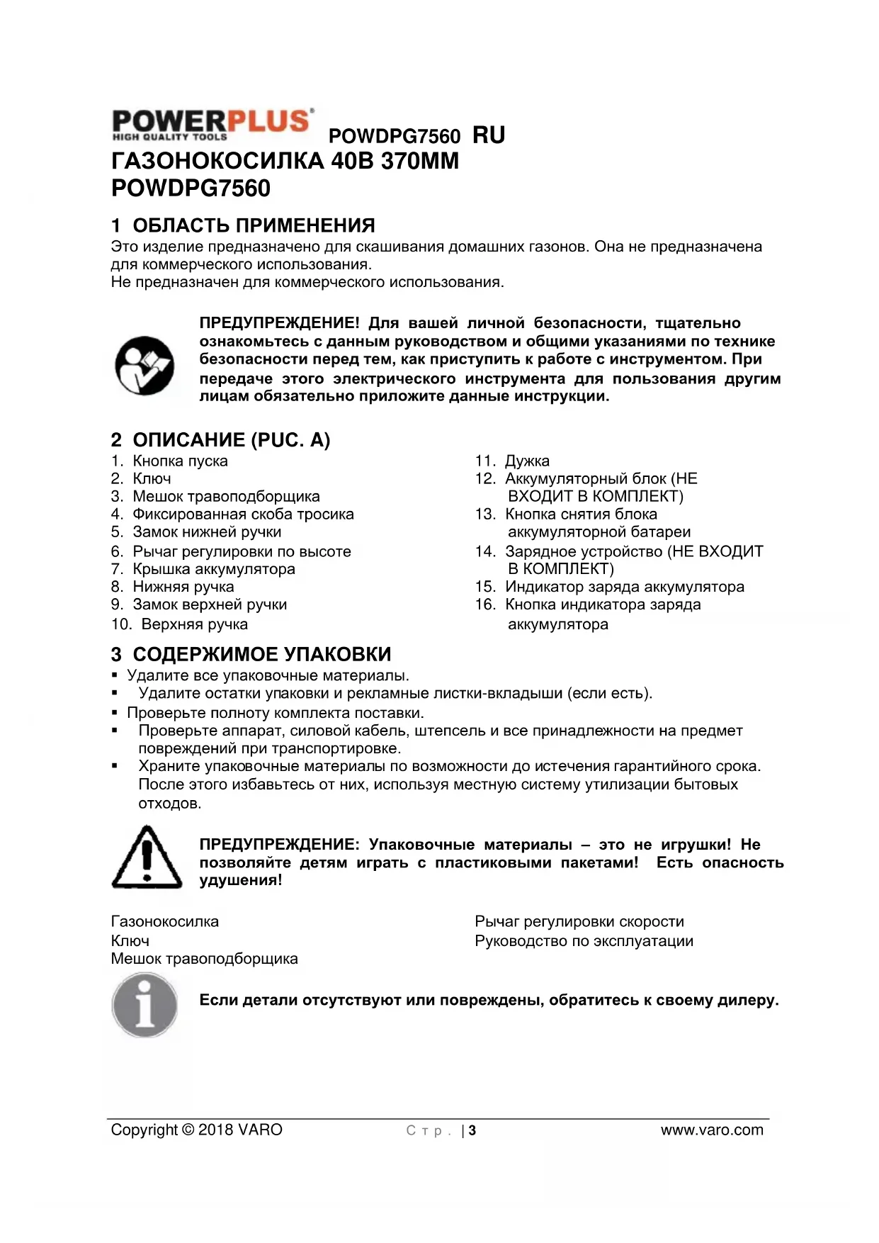 - 16 ДЕКЛАРАЦИЯ О СООТВЕТСТВИИ POWDPG7560 RU Copyright © 2018 VARO С т р . | 3 www.varo.com ГАЗОНОКОСИЛКА 40B 370ММ POWDPG7560 1 ОБЛАСТЬ ПРИМЕНЕНИЯ Это изделие предназначено для скашивания домашних газонов. Она не предназначена для коммерческого использования. Не предназначен для коммерческого использования. ПРЕДУПРЕЖДЕНИЕ! Для вашей личной безопасности, тщательно ознакомьтесь с данным руководством и общими указаниями по технике безопасности перед тем, как приступить к работе с инструментом. При передаче этого электрического инструмента для пользования другим лицам обязательно приложите данные инструкции. 2 ОПИСАНИЕ (РUС. A) p. 16