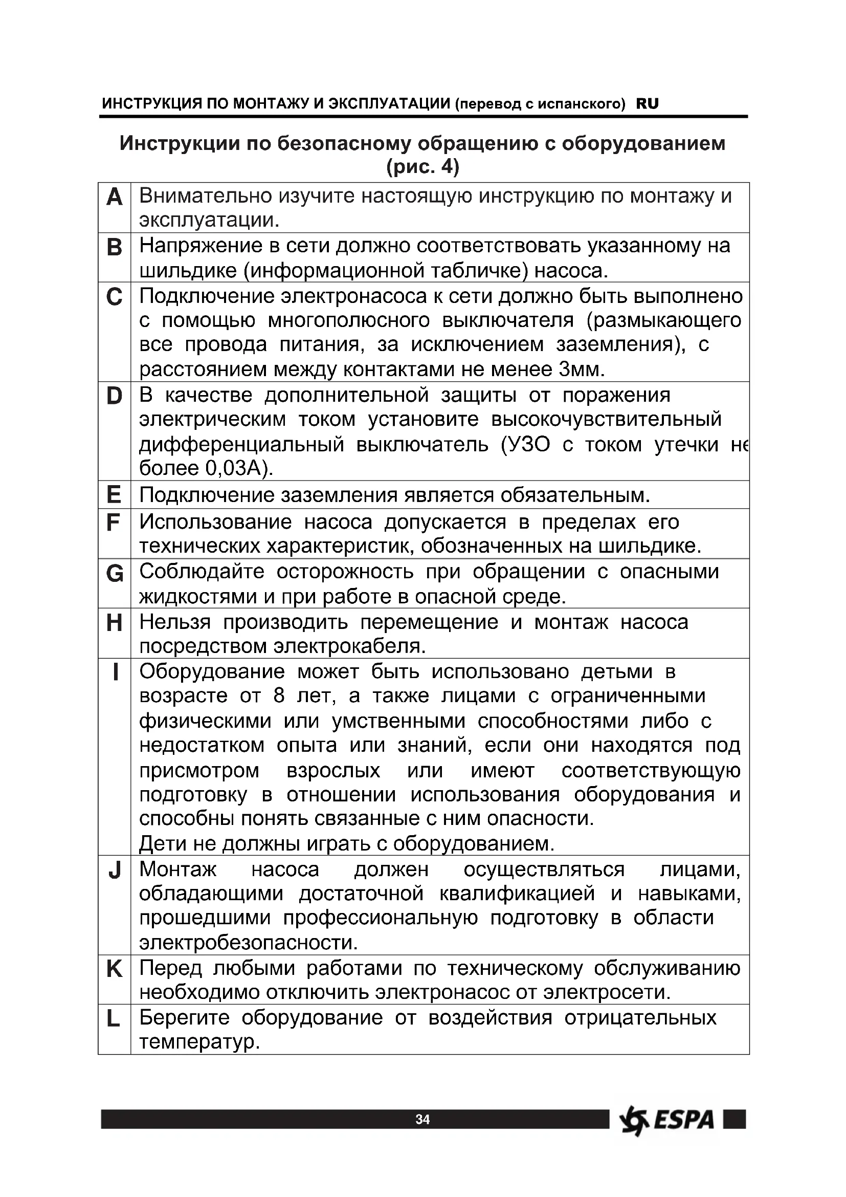 Необходимо не допускать замерзания жидкости внутри насоса. При возникновении неисправностей и необходимости обслуживания, обратитесь в авторизованный сервисный центр. Информация об авторизованных сервисных центрах находится на сайте www.espa.ru