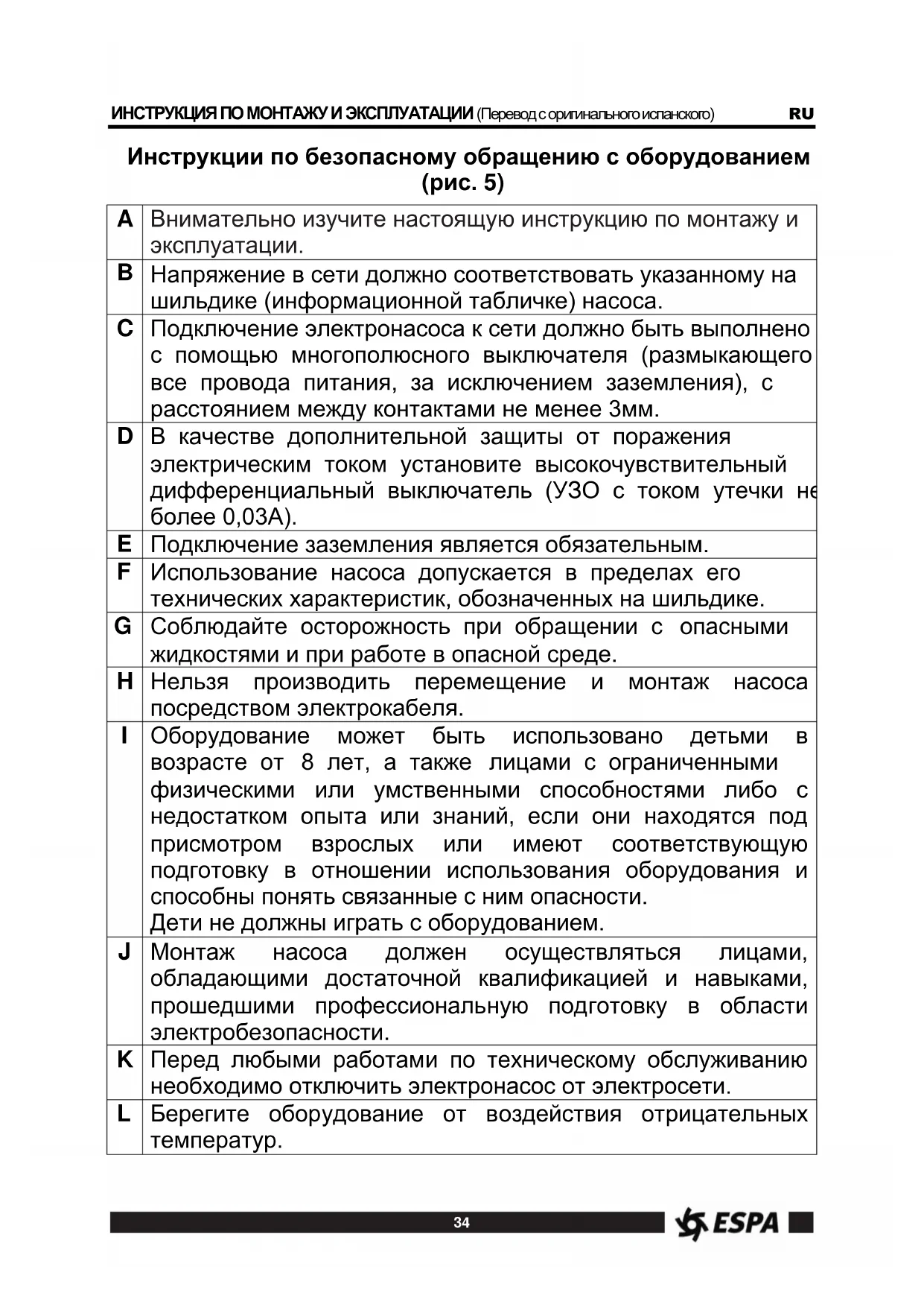 На насосы распространяется гарантия изготовителя, срок действия которой указывается в гарантийном талоне установленного образца (с даты покупки конечным пользователем). Документом, подтверждающим дату продажи, является гарантийный талон. Гарантийный талон должен быть правильно заполнен продавцом оборудования. Его отсутствие или неправильное заполнение может послужить причиной отказа в гарантийном обслуживании оборудования. Гарантийные обязательства включают в себя все производственные дефекты или дефекты комплектующих, подтвержденные производителем. Определение причин возникновения неисправностей насоса производится авторизованными сервисными центрами ESPA. В случае подтверждения производственного брака или дефекта комплектующих сервисным центром производится гарантийный ремонт или замена насоса. Гарантийные обязательства не распространяются на дефекты, возникшие в результате неправильного обращения, неправильного электрического подключения, в случае нарушения правил установки, монтажа, эксплуатации, приведенных в данном руководстве, а также на комплектующие, подверженные естественному износу в процессе эксплуатации, а именно: уплотнения, подшипники, конденсаторы, щетки и т.п. Условия гарантийного обслуживания не применяются в случае обнаружения следов самостоятельной разборки или ремонта насоса.38 AR39 AR40
