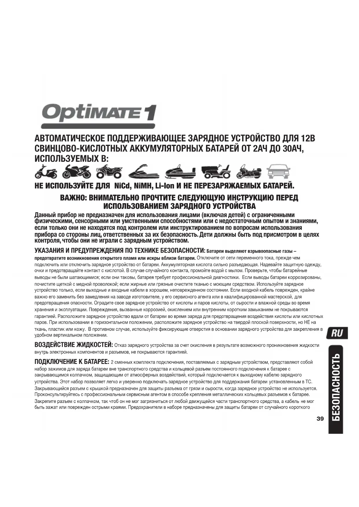 элемента или полной сульфатацией, либо обусловлено тем, что батарея все еще подключена к электросети транспортного средства. Это может сигнализировать о потерях тока в поврежденной проводке, о неисправности переключателя или контакта или о наличии подключенных устройств, потребляющих ток. Внезапное подключение нагрузки, например включение передних фар, в момент, когда зарядное устройство подключено, может также вызвать существенное снижение напряжения аккумуляторной батареи. Необходимо всегда извлекать аккумуляторную батарею из транспортного средства, снова подключать ее к OptiMate™ и запускать программу еще раз. Соответствующую модель OptiMate, способную восстанавливать аккумуляторные батареи с серьезной сульфатацией, можно найти на веб-сайте www.optimate1. com. Поддержка уровня заряда батареи в течение длительных периодов времени Устройство OptiMate способно непрерывно поддерживать уровень заряда аккумуляторной батареи, находящейся в хорошем состоянии, в течение нескольких месяцев. Необходимо проверять надежность соединений между зарядным устройством и батареей не реже, чем каждые две недели, а в случае применения аккумуляторов с крышками заливочного отверстия на каждом элементе следует отсоединить батарею от зарядного устройства, проверить уровень электролита и при необходимости долить жидкость в элементы (дистиллированную воду, НЕ кислоту), затем снова подсоединить к зарядному устройству. При работе с аккумуляторами или возле них всегда следует учитывать ИНСТРУКЦИИ ПО ТЕХНИКЕ БЕЗОПАСНОСТИ, приведенные выше. Время зарядки Время, требующееся OptiMate 1 для зарядки разряженной исправной аккумуляторной батареи, приблизительно равно 1,5 x емкость батареи в ампер-часах. Например, для батареи емкостью 32 А·ч потребуется не более 48 часов, чтобы перейти к шагу 3. Для зарядки глубоко разряженных батарей может понадобиться намного больше времени. ОГРАНИЧЕННАЯ ГАРАНТИЯ TecMate (International) SA, Ambachtenlaan 6, B-3300 Tienen, Бельгия, предоставляет ограниченную гарантию первоначальному розничному покупателю этого продукта. Данная ограниченная гарантия не подлежит передаче другому лицу. TecMate(International) гарантирует качество изготовления данного зарядного устройства в течение трех лет с момента покупки в розничной сети в отношении дефектов материала или изготовления. В случае возникновения дефекта устройство будет отремонтировано или заменено по усмотрению производителя. Покупатель должен направить устройство вместе с доказательством покупки, перевозки, а также оплатить почтовые расходы в адрес производителя или его уполномоченного представителя. Настоящая гарантия недействительна, если продукт неправильно эксплуатировался, подвергался неосторожному обращению или ремонтировался в местах, отличных от завода изготовителя или его уполномоченного представителя. Производитель не дает никаких гарантий, кроме этой ограниченной гарантии и определенно исключает любые подразумеваемые гарантии, включая любые гарантии за косвенные убытки. ЭТА ОГРАНИЧЕННАЯ ГАРАНТИЯ ПРОИЗВОДИТЕЛЯ НЕ ПРИНИМАЕТ НА СЕБЯ И НЕ УПОЛНОМАЧИВАЕТ НИКОГО ПРИНИМАТЬ ЛЮБЫЕ ДРУГИЕ ОБЯЗАТЕЛЬСТВА ПО ОТНОШЕНИЮ К ТОВАРОВАМ, КРОМЕ ЭТОЙ ОГРАНИЧЕННОЙ ГАРАНТИИ. ПРИМЕЧАНИЕ: Подробности на www.tecmate.com / warranty или свяжитесь по warranty@tecmate.com Переводc английского: Общество с ограниченной ответственнос