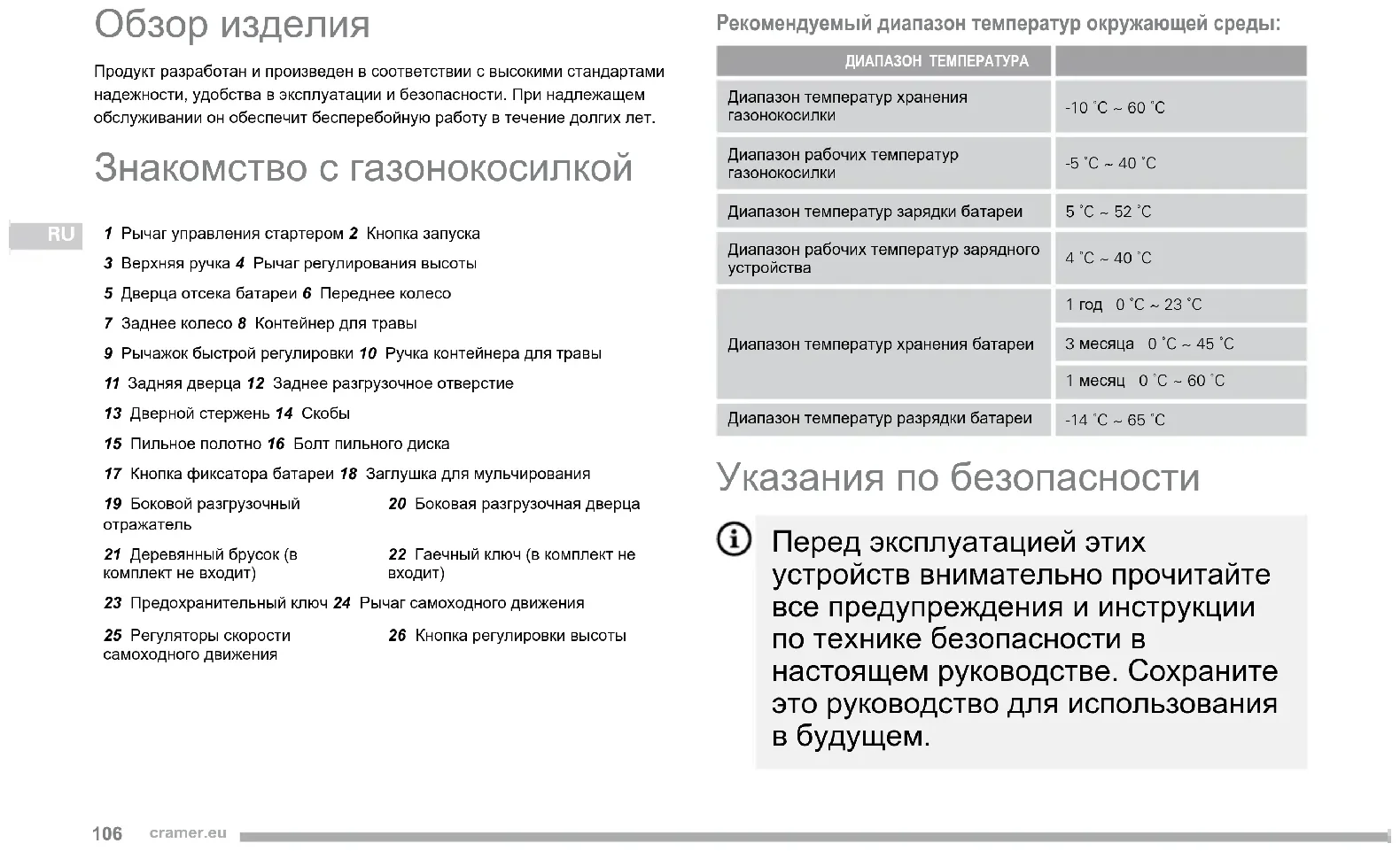 Обзор изделия Продукт разработан и произведен в соответствии с высокими стандартами надежности, удобства в эксплуатации и безопасности. При надлежащем обслуживании он обеспечит бесперебойную работу в течение долгих лет. Знакомство с газонокосилкой 1 Рычаг управления стартером 2 Кнопка запуска3 Верхняя ручка 4 Рычаг регулирования высоты5 Дверца отсека батареи 6 Переднее колесо7 Заднее колесо 8 Контейнер для травы9 Рычажок быстрой регулировки 10 Ручка контейнера для травы11 Задняя дверца 12 Заднее разгрузочное отверстие13 Дверной стержень 14 Скобы15 Пильное полотно 16 Болт пильного диска17 Кнопка фиксатора батареи 18 Заглушка для мульчирования19 Боковой разгрузочный отражатель20 Боковая разгрузочная дверца21 Деревянный брусок (в комплект не входит)22 Гаечный ключ (в комплект не входит)23 Предохранительный ключ 24 Рычаг самоходного движения 25 Регуляторы скорости самоходного движения26 Кнопка регулировки высоты Рекомендуемый диапазон температур окружающей среды: ДИАПАЗОН ТЕМПЕРАТУРА Диапазон температур хранения газонокосилки-10 ˚C ~ 60 ˚C Диапазон рабочих температур газонокосилки-5 ˚C ~ 40 ˚C Диапазон температур зарядки батареи 5 ˚C ~ 52 ˚C Диапазон рабочих температур зарядного устройства 4 ˚C ~ 40 ˚C Диапазон температур хранения батареи 1 год 0 ˚C ~ 23 ˚C 3 месяца 0 ˚C ~ 45 ˚C 1 месяц 0 ˚C ~ 60 ˚CДиапазон температур разрядки батареи -14 ˚C ~ 65 ˚C Указания по безопасности Перед эксплуатацией этих устройств внимательно прочитайте все предупреждения и инструкции по технике безопасности в настоящем руководстве. Сохраните это руководство для использования в будущем.107 cramer.eu