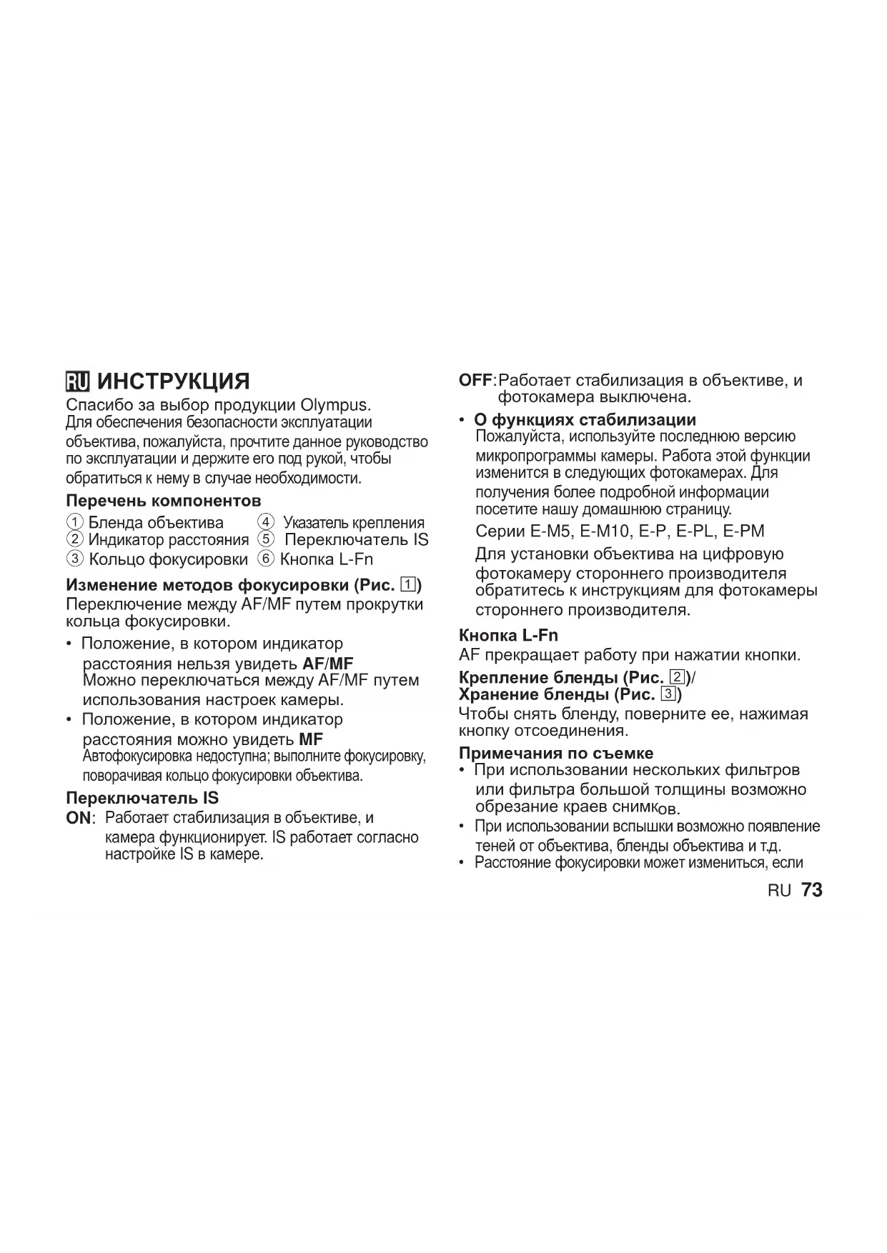 Спасибо за выбор продукции Olympus. Для обеспечения безопасности эксплуатации объектива, пожалуйста, прочтите данное руководство по эксплуатации и держите его под рукой, чтобы обратиться к нему в случае необходимости. Перечень компонентов