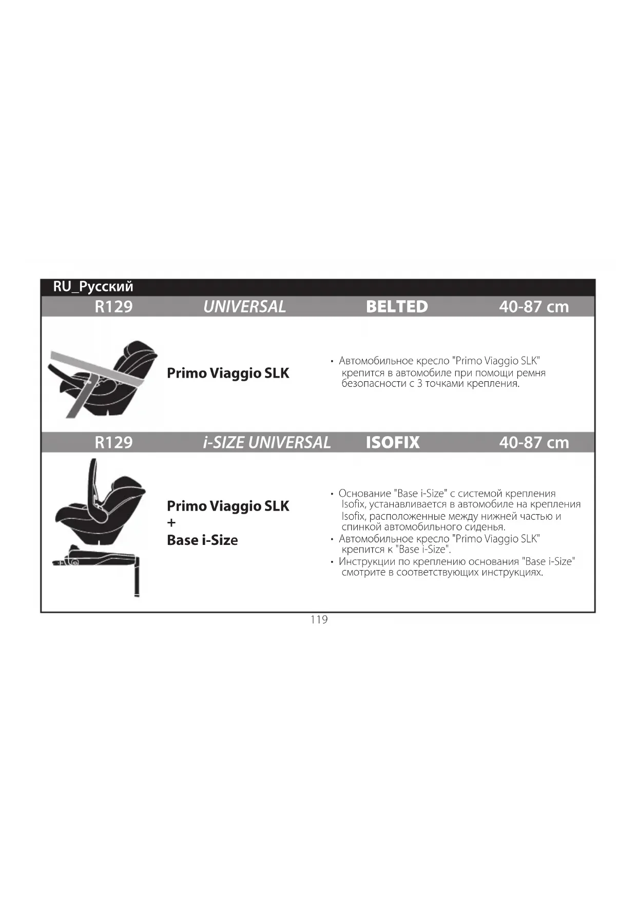 - Инструкции по креплению основания "Base i-Size" смотрите в соответствующих инструкциях. R129 UNIVERSAL BELTED 40-87 cm R129 i-SIZE UNIVERSAL ISOFIX 40-87 cm Primo Viaggio SLK Primo Viaggio SLK