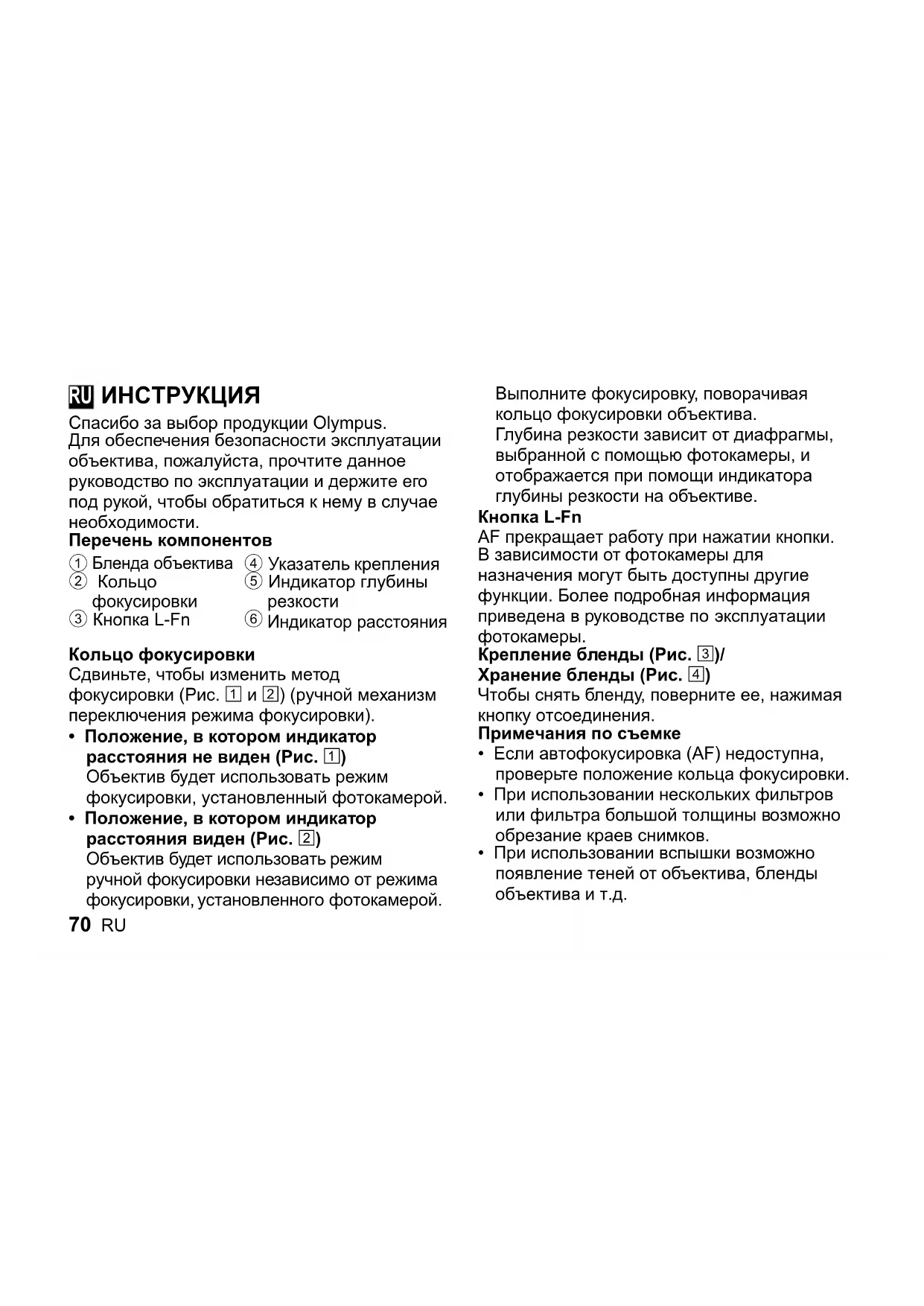 Спасибо за выбор продукции Olympus. Для обеспечения безопасности эксплуатации объектива, пожалуйста, прочтите данное руководство по эксплуатации и держите его под рукой, чтобы обратиться к нему в случае необходимости. Перечень компонентов