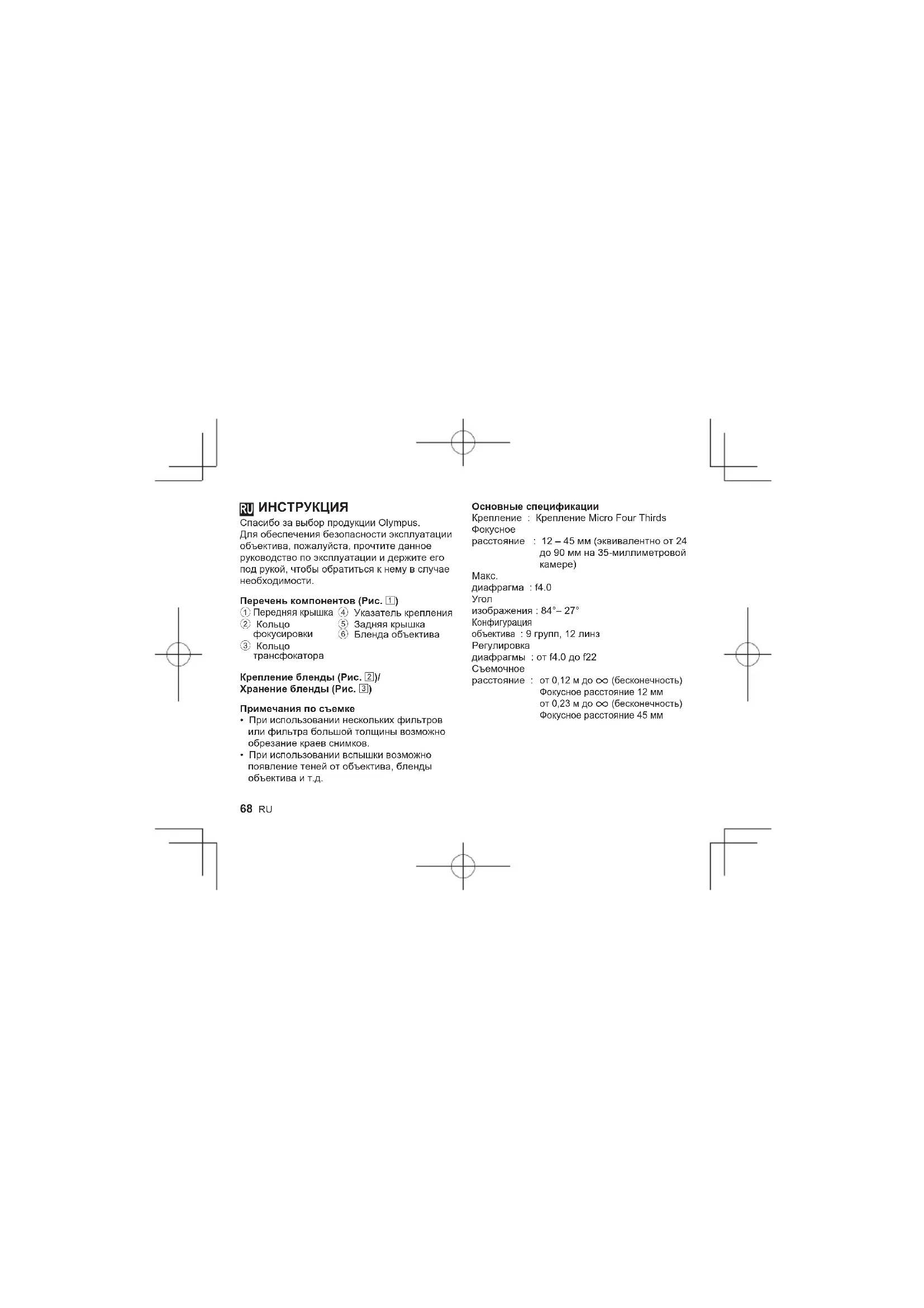 Спасибо за выбор продукции Olympus. Для обеспечения безопасности эксплуатации объектива, пожалуйста, прочтите данное руководство по эксплуатации и держите его под рукой, чтобы обратиться к нему в случае необходимости. Перечень компонентов (Рис. 1)