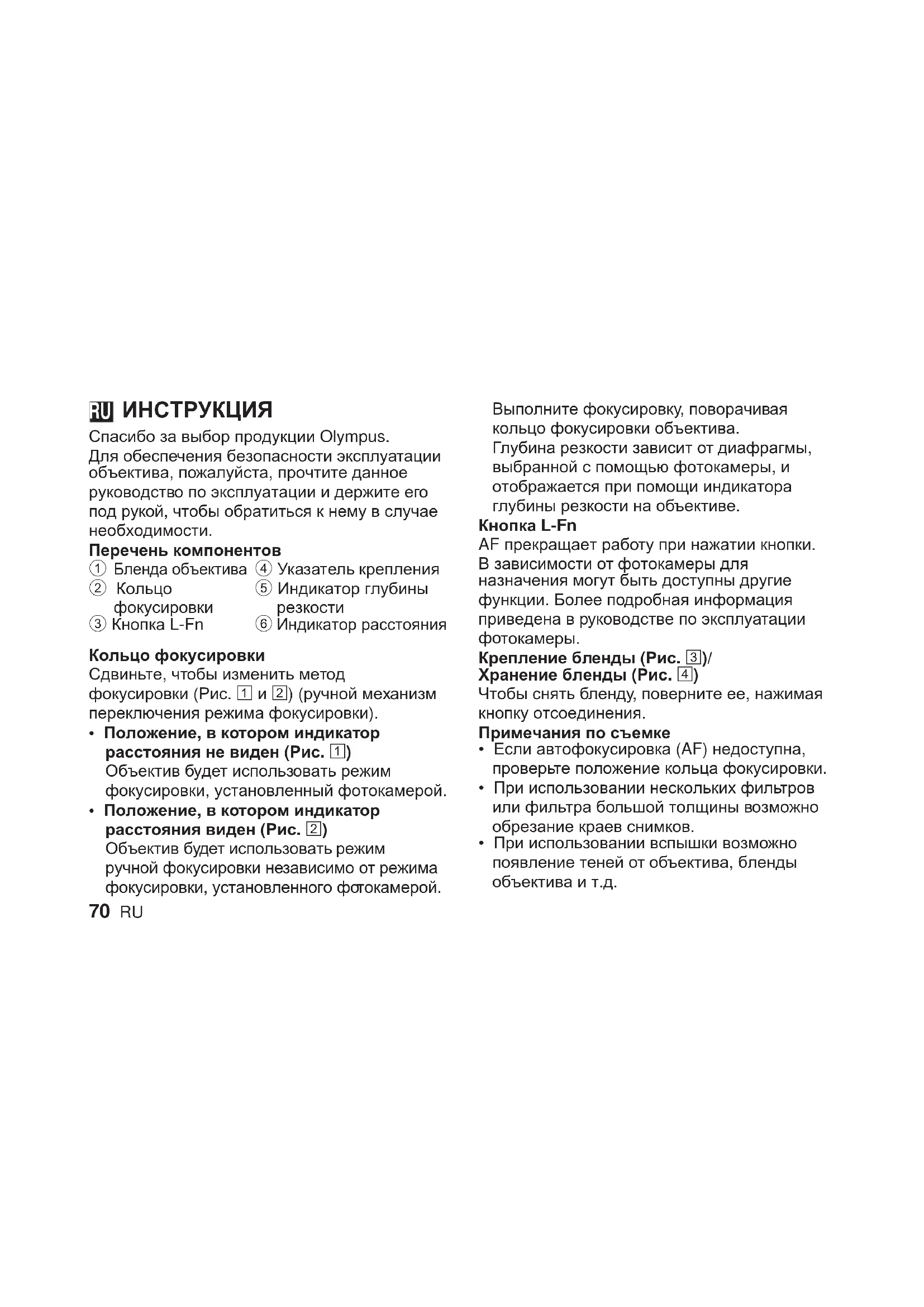 Спасибо за выбор продукции Olympus. Для обеспечения безопасности эксплуатации объектива, пожалуйста, прочтите данное руководство по эксплуатации и держите его под рукой, чтобы обратиться к нему в случае необходимости. Перечень компонентов