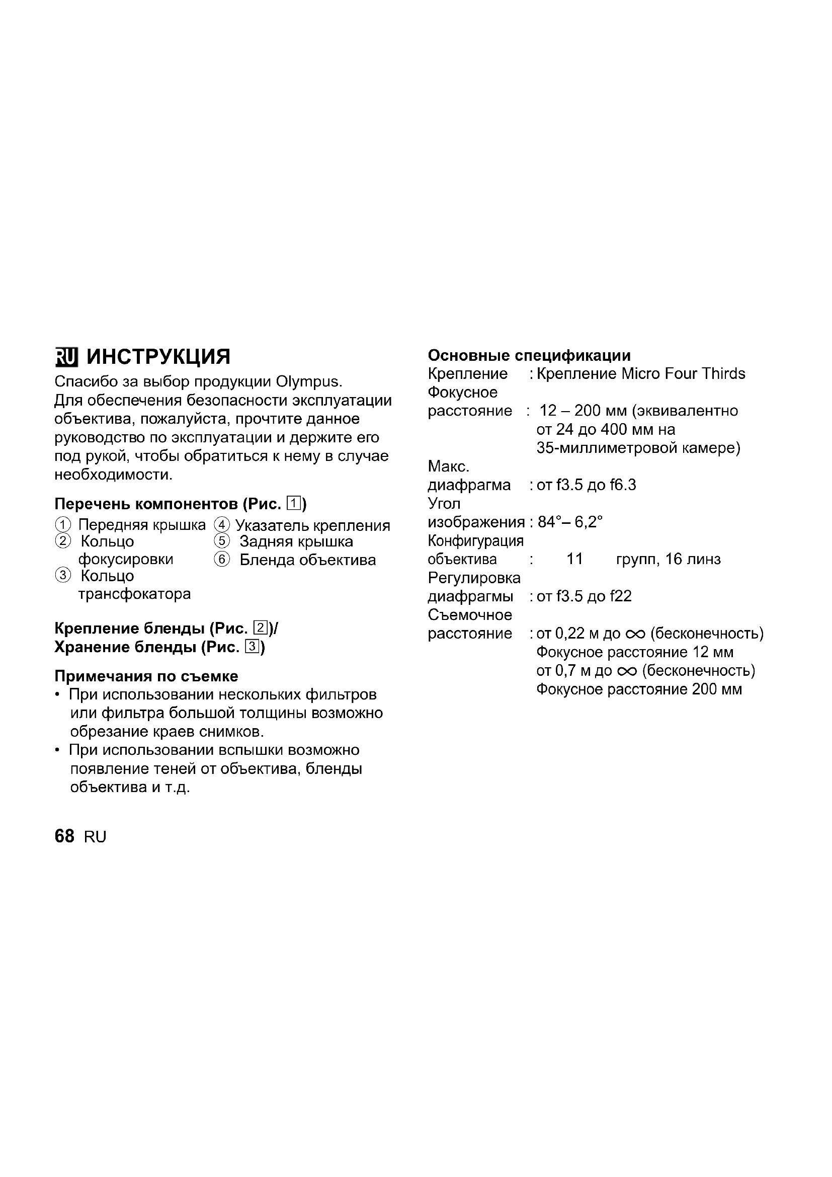Спасибо за выбор продукции Olympus. Для обеспечения безопасности эксплуатации объектива, пожалуйста, прочтите данное руководство по эксплуатации и держите его под рукой, чтобы обратиться к нему в случае необходимости. Перечень компонентов (Рис. 1)