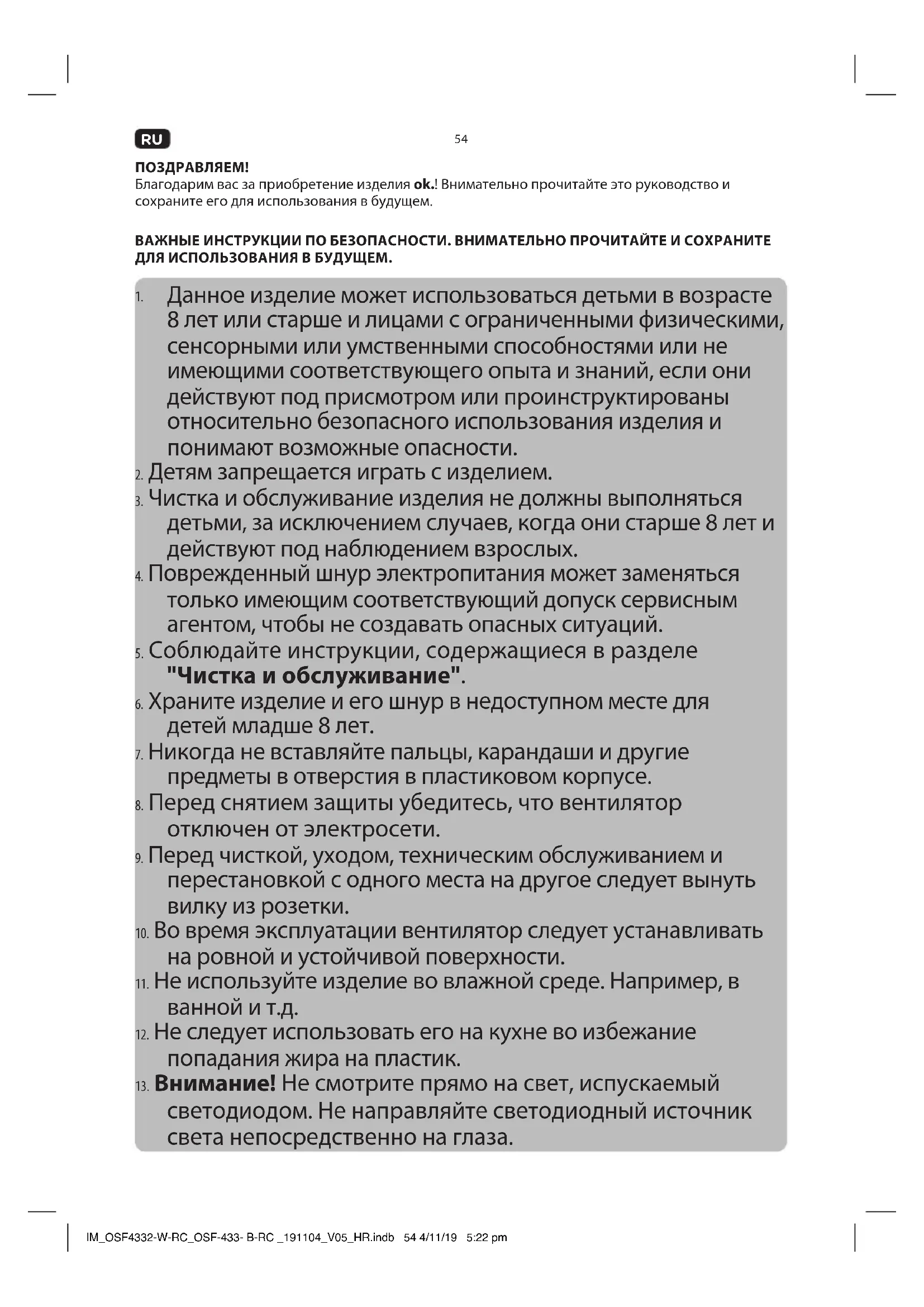 светодиодом. Не направляйте светодиодный источник света непосредственно на глаза. IM_OSF4332-W-RC_OSF-433- B-RC _191104_V05_HR.indb 54 4/11/19 5:22 pm55