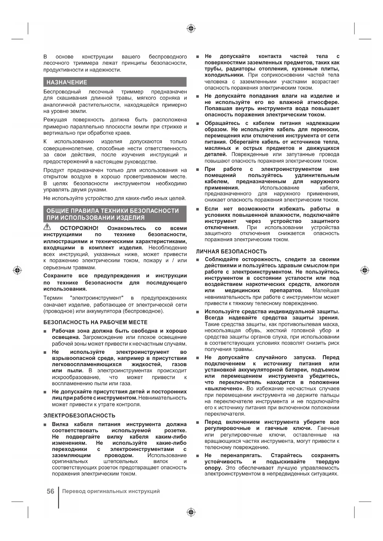 Беспроводный лесочный триммер предназначен для скашивания длинной травы, мягкого сорняка и аналогичной растительности, находящейся примерно на уровне земли. Режущая поверхность должна быть расположена примерно параллельно плоскости земли при стрижке и вертикально при обработке краев. К использованию изделия допускаются только совершеннолетние, способные нести ответственность за свои действия, после изучения инструкций и предостережений в настоящем руководстве. Продукт предназначен только для использования на открытом воздухе в хорошо проветриваемом месте. В целях безопасности инструментом необходимо управлять двумя руками. Не используйте устройство для каких-либо иных целей. ОБЩИЕ ПРАВИЛА ТЕХНИКИ БЕЗОПАСНОСТИ ПРИ ИСПОЛЬЗОВАНИИ ИЗДЕЛИЯ ОСТОРОЖНО! Ознакомьтесь со всеми инструкциями по технике безопасности, иллюстрациями и техническими характеристиками, входящими в комплект изделия. Несоблюдение всех инструкций, указанных ниже, может привести к поражению электрическим током, пожару и / или серьезным травмам. Сохраните все предупреждения и инструкции по технике безопасности для последующего использования. Термин "электроинструмент" в предупреждениях означает изделие, работающее от электрической сети (проводное) или аккумулятора (беспроводное). БЕЗОПАСНОСТЬ НА РАБОЧЕМ МЕСТЕ ■ Рабочая зона должна быть свободна и хорошо освещена. Загромождение или плохое освещение рабочей зоны может привести к несчастным случаям. ■ Не используйте электроинструмент во взрывоопасной среде, например в присутствии легковоспламеняющихся жидкостей, газов или пыли. В электроинструментах происходит искрообразование, что может привести к воспламенению пыли или газа. ■ Не допускайте присутствия детей и посторонних лиц при работе с инструментом. Невнимательность может привести к утрате контроля. ЭЛЕКТРОБЕЗОПАСНОСТЬ ■ Вилка кабеля питания инструмента должна соответствовать используемой розетке. Не подвергайте вилку кабеля каким-либо изменениям. Не используйте какие-либо переходники с электроинструментами с заземляющим проводом. Использование оригинальных штепсельных вилок и соответствующих розеток предотвращает опасность поражения электрическим током. ■ Не допускайте контакта частей тела с поверхностями заземленных предметов, таких как трубы, радиаторы отопления, кухонные плиты, холодильники. При соприкосновении частей тела человека с заземленными участками возрастает опасность поражения электрическим током. ■ Не допускайте попадания влаги на изделие и не используйте его во влажной атмосфере. Попавшая внутрь инструмента вода повышает опасность поражения электрическим током. ■ Обращайтесь с кабелем питания надлежащим образом. Не используйте кабель для переноски, перемещения или отключения инструмента от сети питания. Оберегайте кабель от источников тепла, масляных и острых предметов и движущихся деталей. Поврежденные или запутанные провода повышают опасность поражения электрическим током. ■ При работе с электроинструментом вне помещений пользуйтесь удлинительным кабелем, предназначенным для наружного применения. Использование кабеля, предназначенного для наружного применения, снижает опасность поражения электрическим током. ■ Если нет возможности избежать работы в условиях повышенной влажности, п