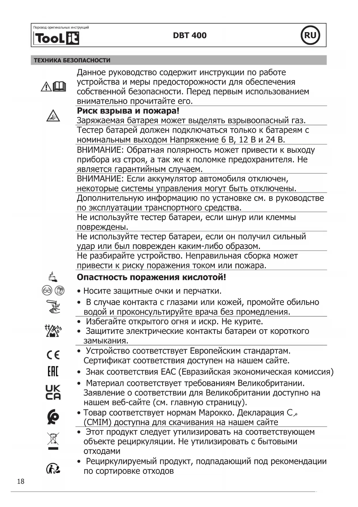 Traducción de las instrucciones originalesПеревод оригинальных инструкций ТЕХНИКА БЕЗОПАСНОСТИ Данное руководство содержит инструкции по работе устройства и меры предосторожности для обеспечения собственной безопасности. Перед первым использованием внимательно прочитайте его. Риск взрыва и пожара! Заряжаемая батарея может выделять взрывоопасный газ. Тестер батарей должен подключаться только к батареям с номинальным выходом Напряжение 6 В, 12 В и 24 В. ВНИМАНИЕ: Обратная полярность может привести к выходу прибора из строя, а так же к поломке предохранителя. Не является гарантийным случаем. ВНИМАНИЕ: Если аккумулятор автомобиля отключен, некоторые системы управления могут быть отключены. Дополнительную информацию по установке см. в руководстве по эксплуатации транспортного средства. Не используйте тестер батареи, если шнур или клеммы повреждены. Не используйте тестер батареи, если он получил сильный удар или был поврежден каким-либо образом. Не разбирайте устройство. Неправильная сборка может привести к риску поражения током или пожара. Опастность поражения кислотой!
