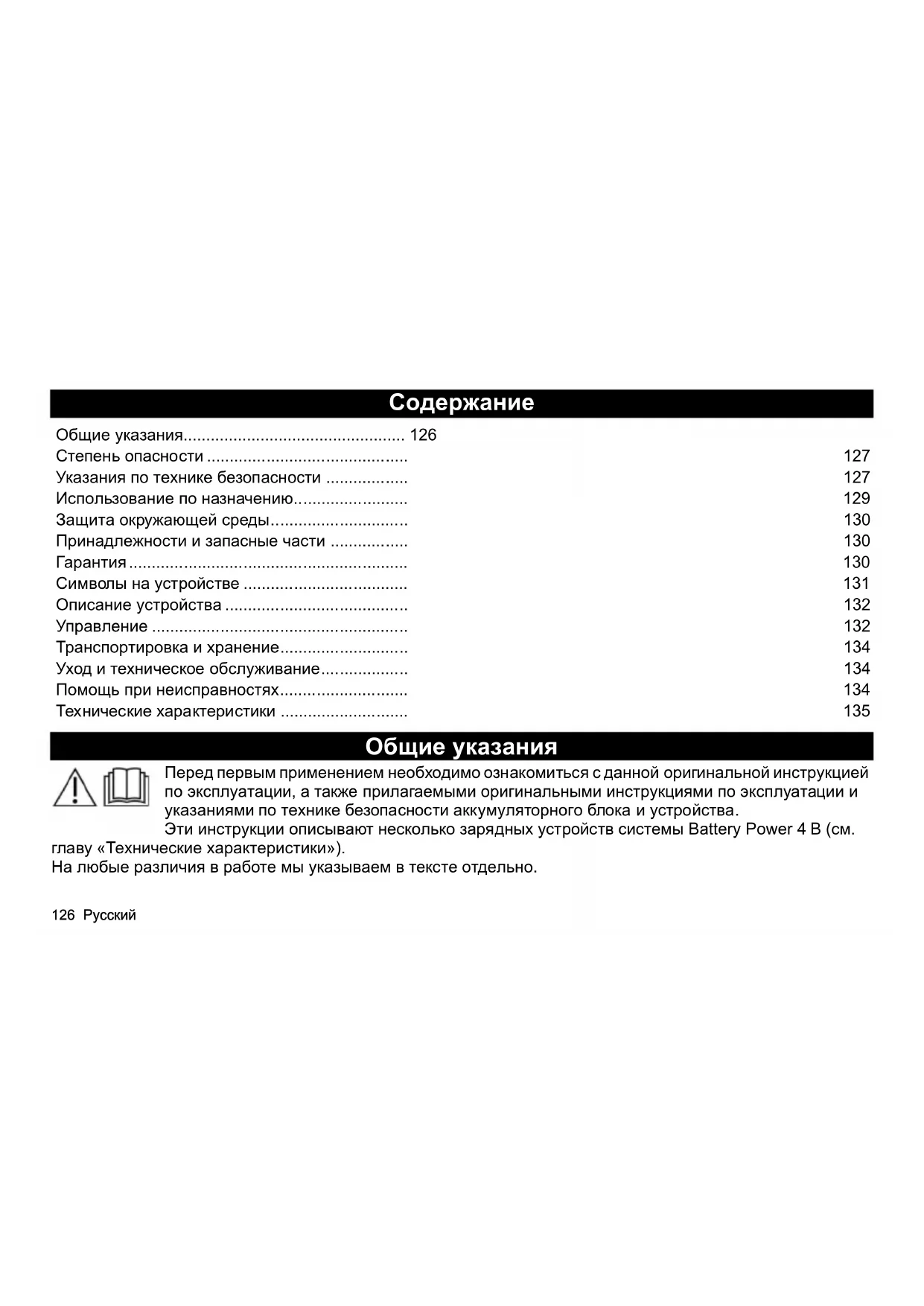 Общие указания Перед первым применением необходимо ознакомиться с данной оригинальной инструкцией по эксплуатации, а также прилагаемыми оригинальными инструкциями по эксплуатации и указаниями по технике безопасности аккумуляторного блока и устройства. Эти инструкции описывают несколько зарядных устройств системы Battery Power 4 В (см. главу «Технические характеристики»). На любые различия в работе мы указываем в тексте отдельно.