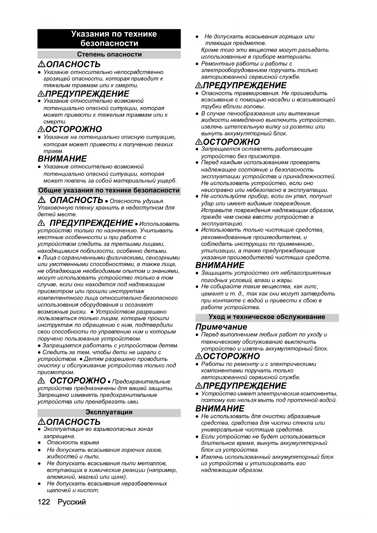 ● Перед выполнением любых работ по уходу и техническому обслуживанию выключить устройство и извлечь аккумуляторный блок. 몇 ОСТОРОЖНО ● Работы по ремонту и с электрическими компонентами поручать только авторизованной сервисной службе. 몇 ПРЕДУПРЕЖДЕНИЕ ● Устройство имеет электрические компоненты,