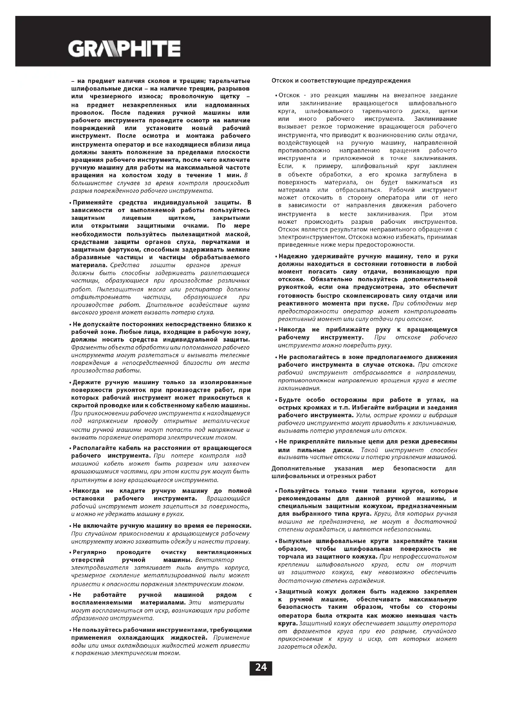 - Будьте особо осторожны при работе в углах, на острых кромках и т.п. Избегайте вибрации и заедания рабочего инструмента. Углы, острые кромки и вибрация рабочего инструмента могут приводить к заклиниванию, вызывать потерю управления или отскок.