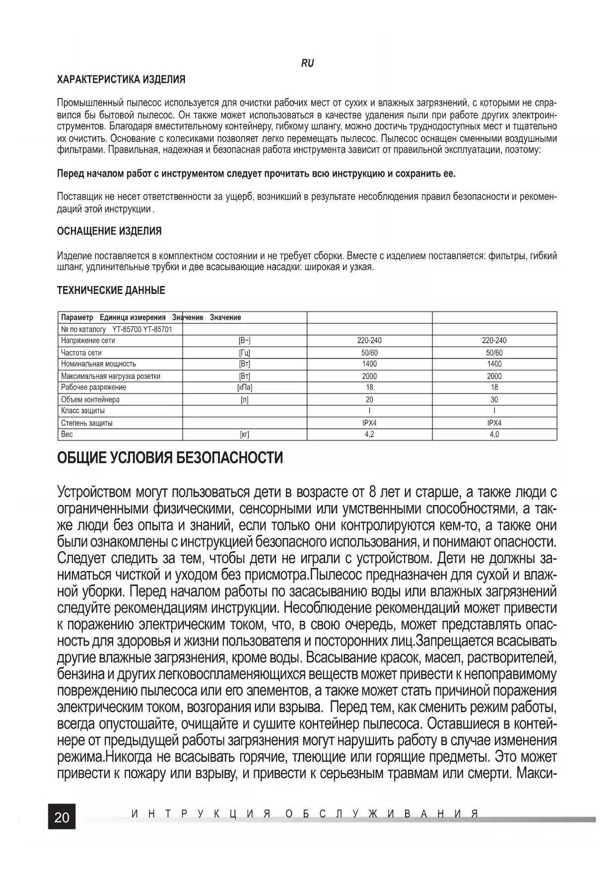 ОСНАЩЕНИЕ ИЗДЕЛИЯ Изделие поставляется в комплектном состоянии и не требует сборки. Вместе с изделием поставляется: фильтры, гибкий шланг, удлинительные трубки и две всасывающие насадки: широкая и узкая. ТЕХНИЧЕСКИЕ ДАННЫЕ Параметр Единица измерения Значение Значение № по каталогу YT-85700 YT-85701 Напряжение сети [В~] 220-240 220-240 Частота сети [Гц] 50/60 50/60 Номинальная мощность [Вт] 1400 1400 Максимальная нагрузка розетки [Вт] 2000 2000 Рабочее разряжение [кПа]18 18 Объем контейнера [л]2030 Класс защиты II Степень защиты IPX4 IPX4 Вес [кг] 4,2 4,0 ОБЩИЕ УСЛОВИЯ БЕЗОПАСНОСТИ Устройством могут пользоваться дети в возрасте от 8 лет и старше, а также люди с ограниченными физическими, сенсорными или умственными способностями, а так- же люди без опыта и знаний, если только они контролируются кем-то, а также они были ознакомлены с инструкцией безопасного использования, и понимают опасности. Следует следить за тем, чтобы дети не играли с устройством. Дети не должны за- ниматься чисткой и уходом без присмотра.Пылесос предназначен для сухой и влаж- ной уборки. Перед началом работы по засасыванию воды или влажных загрязнений следуйте рекомендациям инструкции. Несоблюдение рекомендаций может привести к поражению электрическим током, что, в свою очередь, может представлять опас- ность для здоровья и жизни пользователя и посторонних лиц.Запрещается всасывать другие влажные загрязнения, кроме воды. Всасывание красок, масел, растворителей, бензина и других легковоспламеняющихся веществ может привести к непоправимому повреждению пылесоса или его элементов, а также может стать причиной поражения электрическим током, возгорания или взрыва. Перед тем, как сменить режим работы, всегда опустошайте, очищайте и сушите контейнер пылесоса. Оставшиеся в контей- нере от предыдущей работы загрязнения могут нарушить работу в случае изменения режима.Никогда не всасывать горячие, тлеющие или горящие предметы. Это может привести к пожару или взрыву, и привести к серьезным травмам или смерти. Макси-21 ИНТРУКЦИЯ ОБСЛУЖИВАНИЯ