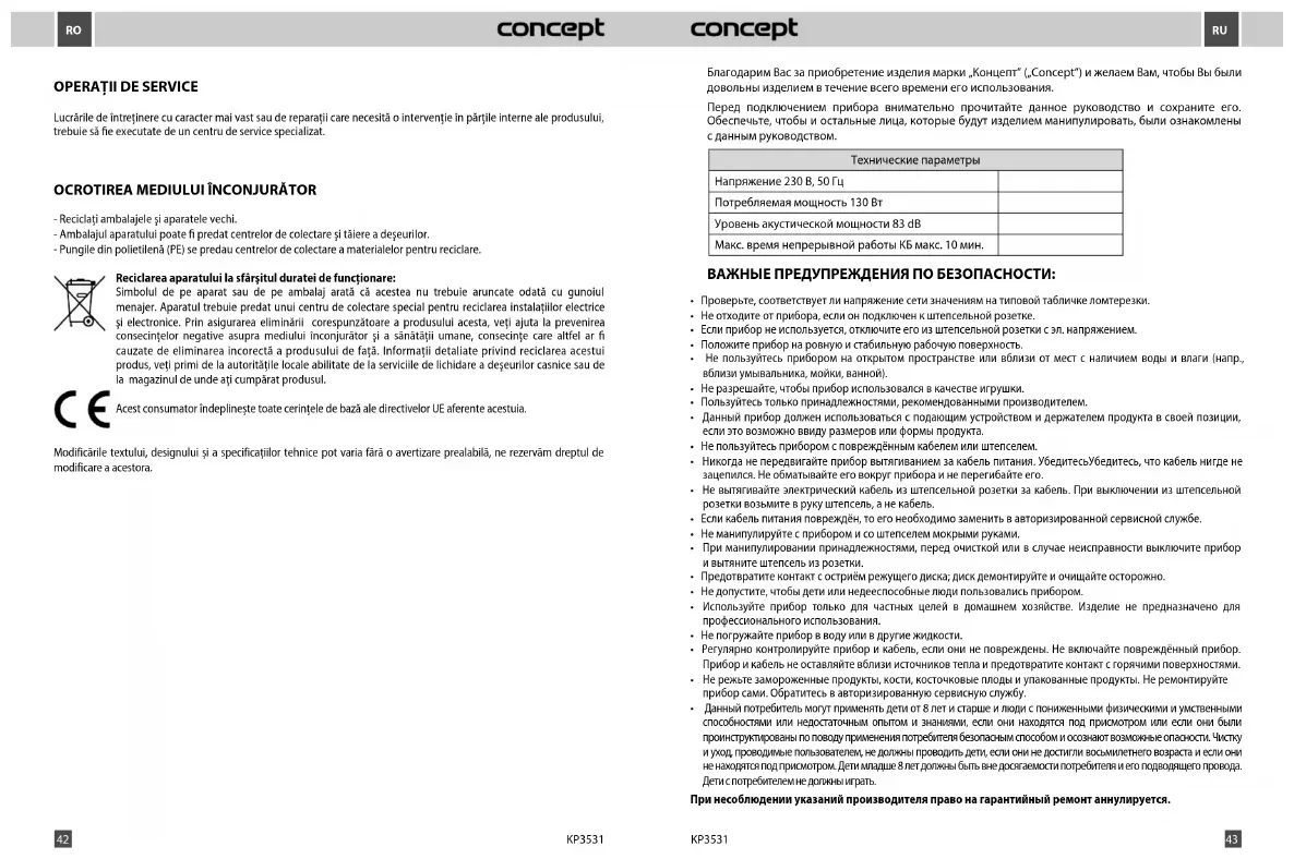 17KP3530 Благодарим Вас за приобретение изделия марки „Концепт“ („Concept“) и желаем Вам, чтобы Вы были довольны изделием в течение всего времени его использования. Перед подключением прибора внимательно прочитайте данное руководство и сохраните его. Обеспечьте, чтобы и остальные лица, которые будут изделием манипулировать, были ознакомлены с данным руководством. Технические параметры Напряжение 230 В, 50 Гц Потребляемая мощность 130 Вт Уровень акустической мощности 83 dB Макс. время непрерывной работы KБ макс. 10 мин. ВАЖНЫЕ ПРЕДУПРЕЖДЕНИЯ ПО БЕЗОПАСНОСТИ: