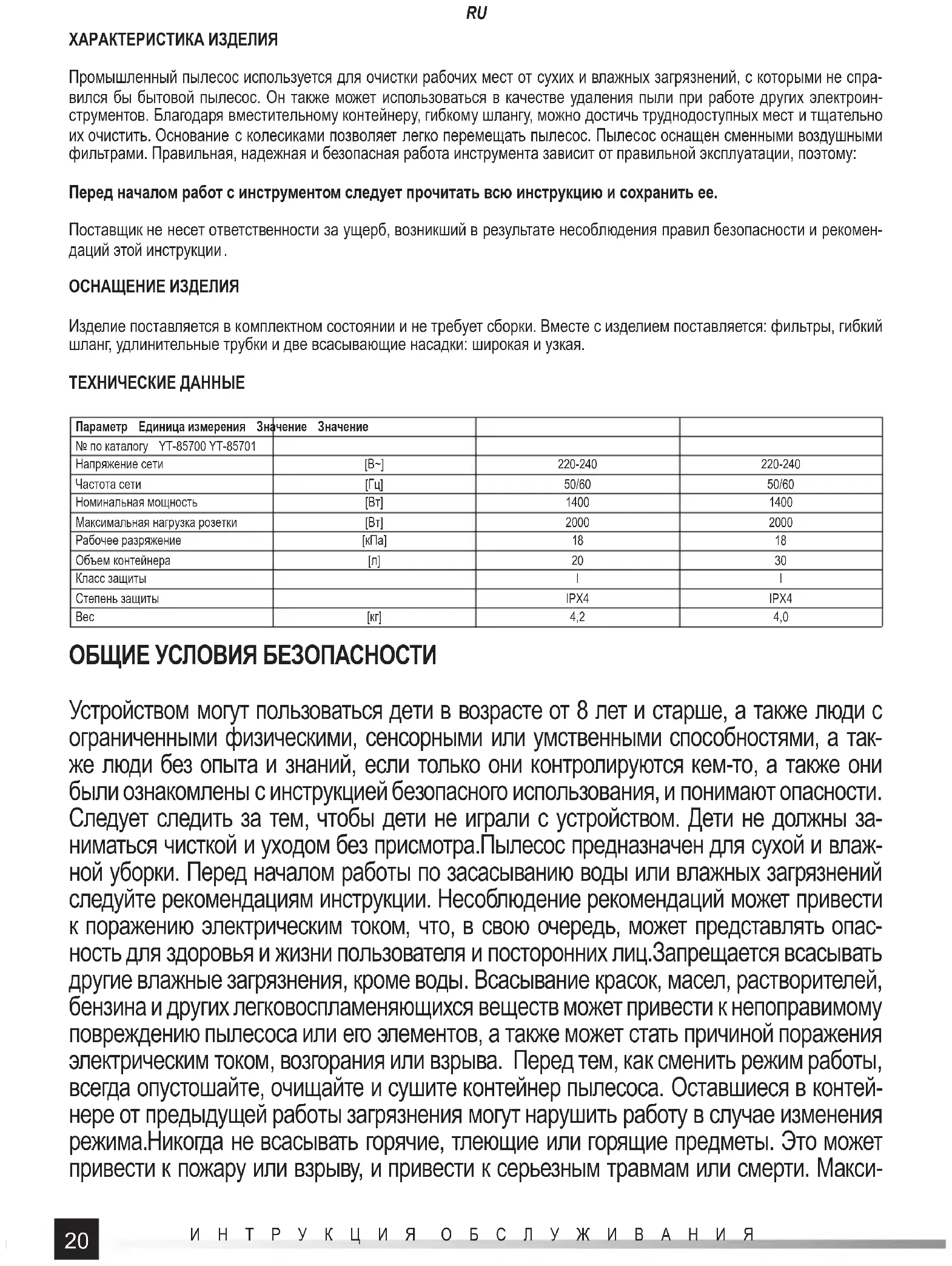 ОСНАЩЕНИЕ ИЗДЕЛИЯ Изделие поставляется в комплектном состоянии и не требует сборки. Вместе с изделием поставляется: фильтры, гибкий шланг, удлинительные трубки и две всасывающие насадки: широкая и узкая. ТЕХНИЧЕСКИЕ ДАННЫЕ Параметр Единица измерения Значение Значение № по каталогу YT-85700 YT-85701 Напряжение сети [В~] 220-240 220-240 Частота сети [Гц] 50/60 50/60 Номинальная мощность [Вт] 1400 1400 Максимальная нагрузка розетки [Вт] 2000 2000 Рабочее разряжение [кПа]18 18 Объем контейнера [л]2030 Класс защиты II Степень защиты IPX4 IPX4 Вес [кг] 4,2 4,0 ОБЩИЕ УСЛОВИЯ БЕЗОПАСНОСТИ Устройством могут пользоваться дети в возрасте от 8 лет и старше, а также люди с ограниченными физическими, сенсорными или умственными способностями, а так- же люди без опыта и знаний, если только они контролируются кем-то, а также они были ознакомлены с инструкцией безопасного использования, и понимают опасности. Следует следить за тем, чтобы дети не играли с устройством. Дети не должны за- ниматься чисткой и уходом без присмотра.Пылесос предназначен для сухой и влаж- ной уборки. Перед началом работы по засасыванию воды или влажных загрязнений следуйте рекомендациям инструкции. Несоблюдение рекомендаций может привести к поражению электрическим током, что, в свою очередь, может представлять опас- ность для здоровья и жизни пользователя и посторонних лиц.Запрещается всасывать другие влажные загрязнения, кроме воды. Всасывание красок, масел, растворителей, бензина и других легковоспламеняющихся веществ может привести к непоправимому повреждению пылесоса или его элементов, а также может стать причиной поражения электрическим током, возгорания или взрыва. Перед тем, как сменить режим работы, всегда опустошайте, очищайте и сушите контейнер пылесоса. Оставшиеся в контей- нере от предыдущей работы загрязнения могут нарушить работу в случае изменения режима.Никогда не всасывать горячие, тлеющие или горящие предметы. Это может привести к пожару или взрыву, и привести к серьезным травмам или смерти. Макси-21 ИНТРУКЦИЯ ОБСЛУЖИВАНИЯ