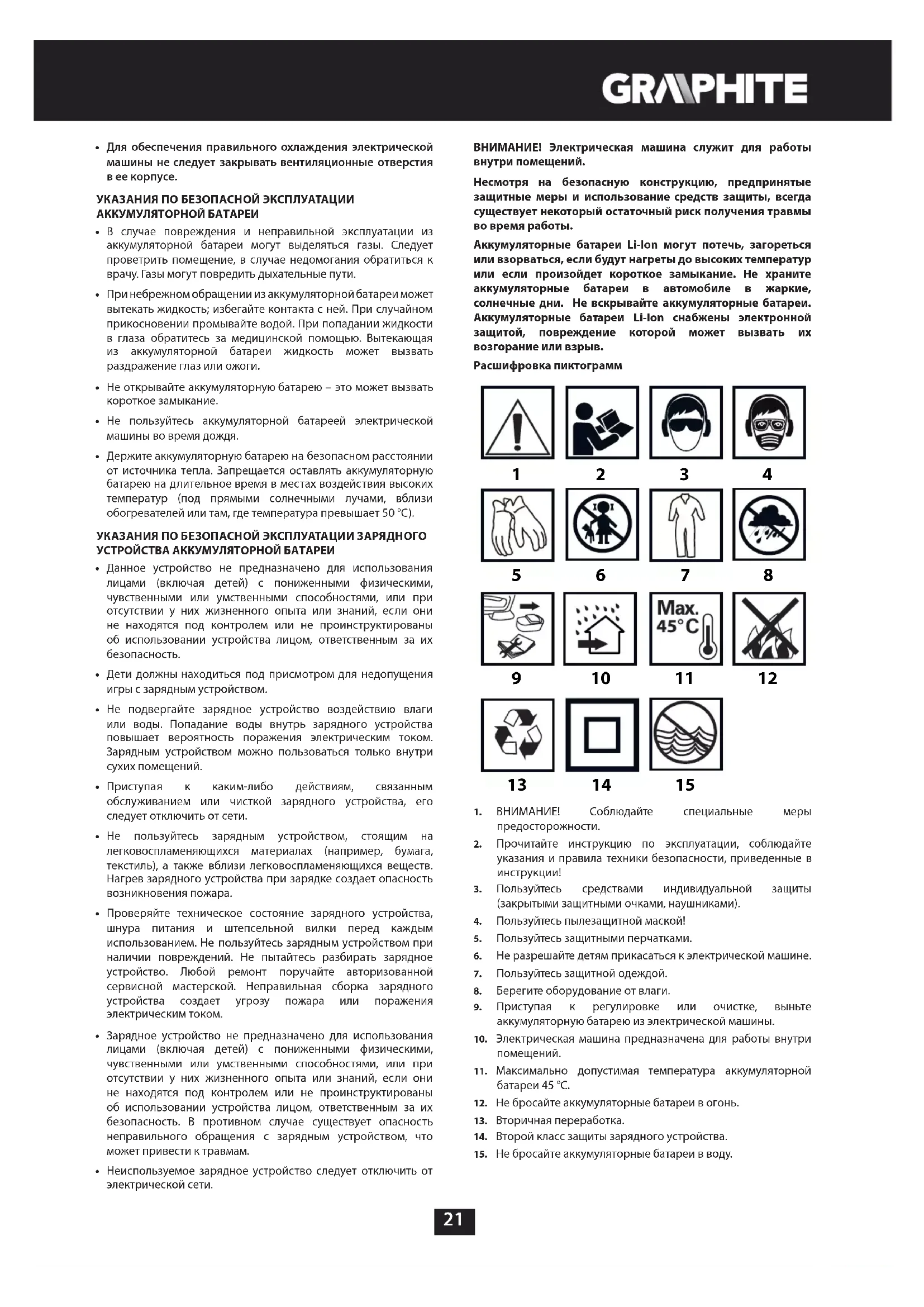 - Неиспользуемое зарядное устройство следует отключить от электрической сети. ВНИМАНИЕ! Электрическая машина служит для работы внутри помещений. Несмотря на безопасную конструкцию, предпринятые защитные меры и использование средств защиты, всегда существует некоторый остаточный риск получения травмы во время работы. Аккумуляторные батареи Li-Ion могут потечь, загореться или взорваться, если будут нагреты до высоких температур или если произойдет короткое замыкание. Не храните аккумуляторные батареи в автомобиле в жаркие, солнечные дни. Не вскрывайте аккумуляторные батареи. Аккумуляторные батареи Li-Ion снабжены электронной защитой, повреждение которой может вызвать их возгорание или взрыв. Расшифровка пиктограмм