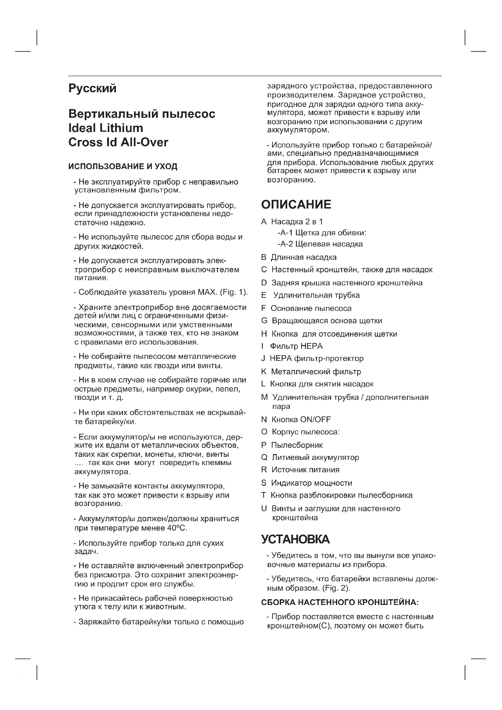 - Соблюдайте указатель уровня MAX. (Fig. 1). - Храните электроприбор вне досягаемости детей и/или лиц с ограниченными физи- ческими, сенсорными или умственными возможностями, а также тех, кто не знаком с правилами его использования. - Не собирайте пылесосом металлические предметы, такие как гвозди или винты. - Ни в коем случае не собирайте горячие или острые предметы, например окурки, пепел, гвозди и т. д. - Ни при каких обстоятельствах не вскрывай- те батарейку/ки. - Если аккумулятор/ы не используются, дер- жите их вдали от металлических объектов, таких как скрепки, монеты, ключи, винты .... так как они могут повредить клеммы аккумулятора. - Не замыкайте контакты аккумулятора, так как это может привести к взрыву или возгоранию. - Аккумулятор/ы должен/должны храниться при температуре менее 40ºC. - Используйте прибор только для сухих