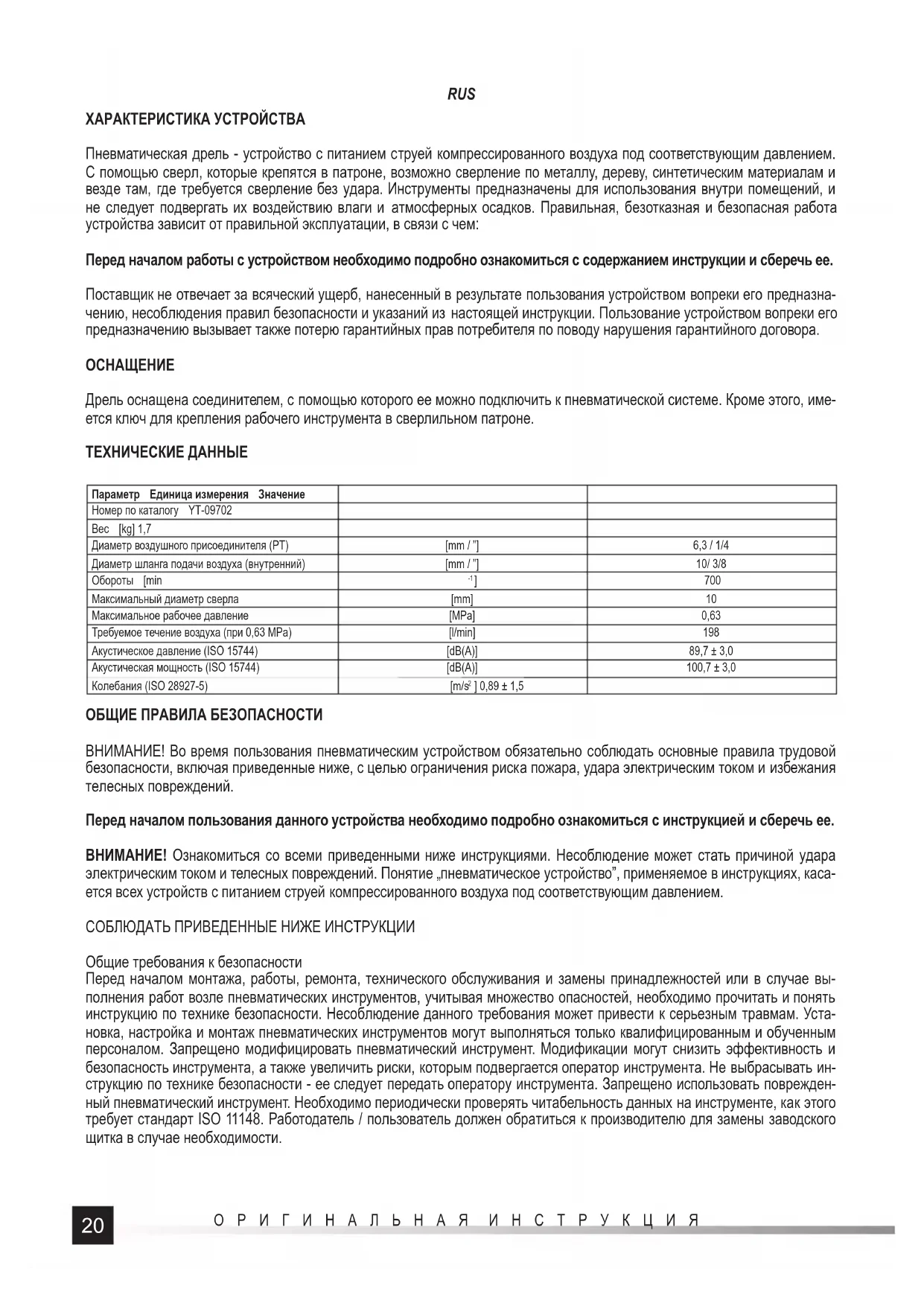 ] 0,89 ± 1,5 ОБЩИЕ ПРАВИЛА БЕЗОПАСНОСТИ ВНИМАНИЕ! Во время пользования пневматическим устройством обязательно соблюдать основные правила трудовой безопасности, включая приведенные ниже, с целью ограничения риска пожара, удара электрическим током и избежания телесных повреждений. Перед началом пользования данного устройства необходимо подробно ознакомиться с инструкцией и сберечь ее. ВНИМАНИЕ! Ознакомиться со всеми приведенными ниже инструкциями. Несоблюдение может стать причиной удара электрическим током и телесных повреждений. Понятие „пневматическое устройство”, применяемое в инструкциях, каса- ется всех устройств с питанием струей компрессированного воздуха под соответствующим давлением. СОБЛЮДАТЬ ПРИВЕДЕННЫЕ НИЖЕ ИНСТРУКЦИИ Общие требования к безопасности Перед началом монтажа, работы, ремонта, технического обслуживания и замены принадлежностей или в случае вы- полнения работ возле пневматических инструментов, учитывая множество опасностей, необходимо прочитать и понять инструкцию по технике безопасности. Несоблюдение данного требования может привести к серьезным травмам. Уста- новка, настройка и монтаж пневматических инструментов могут выполняться только квалифицированным и обученным персоналом. Запрещено модифицировать пневматический инструмент. Модификации могут снизить эффективность и безопасность инструмента, а также увеличить риски, которым подвергается оператор инструмента. Не выбрасывать ин- струкцию по технике безопасности - ее следует передать оператору инструмента. Запрещено использовать поврежден- ный пневматический инструмент. Необходимо периодически проверять читабельность данных на инструменте, как этого требует стандарт ISO 11148. Работодатель / пользователь должен обратиться к производителю для замены заводского щитка в случае необходимости.21 ОРИГИНАЛЬНАЯ ИНСТРУКЦИЯ RUS Опасности, связанные с выбрасываемыми элементами Повреждение обрабатываемого предмета, принадлежностей или даже сменного рабочего инструмента может стать при- чиной выброса элемента на высокой скорости. Всегда необходимо использовать ударопрочную защиту для глаз. Степень защиты следует подбирать в зависимости от выполняемой работы. Обязательно вынуть ключ из патрона дрели перед началом сверления. Убедиться, что обрабатываемый предмет надежно закреплен. Опасности, связанные с запутыванием Запутывание может стать причиной удушья, оскальпирования и/или травмы, если свободная одежда, украшения, волосы и перчатки не удерживать вдали от инструментов или принадлежностей. Опасности, связанные с работой Во время использования инструмента руки оператора могут подвергаться следующим опасностям: дробление, удары, отрезание, стирание, ожоги. Необходимо использовать соответствующие перчатки для защиты рук. Оператор и обслу- живающий персонал должны быть физически в состоянии справиться с размером, весом и мощностью инструмента. Следует правильно держать инструмент. Быть готовым отреагировать на нормальные или неожиданные движения, а также всегда быть готовым использовать обе руки. При сверлении или просверливании обрабатываемого материала в результате слишком сильного нажима на сверло может образоваться высокий вращающий момент реакции. В любом случае, рекомендуется использовать средства для поглощени