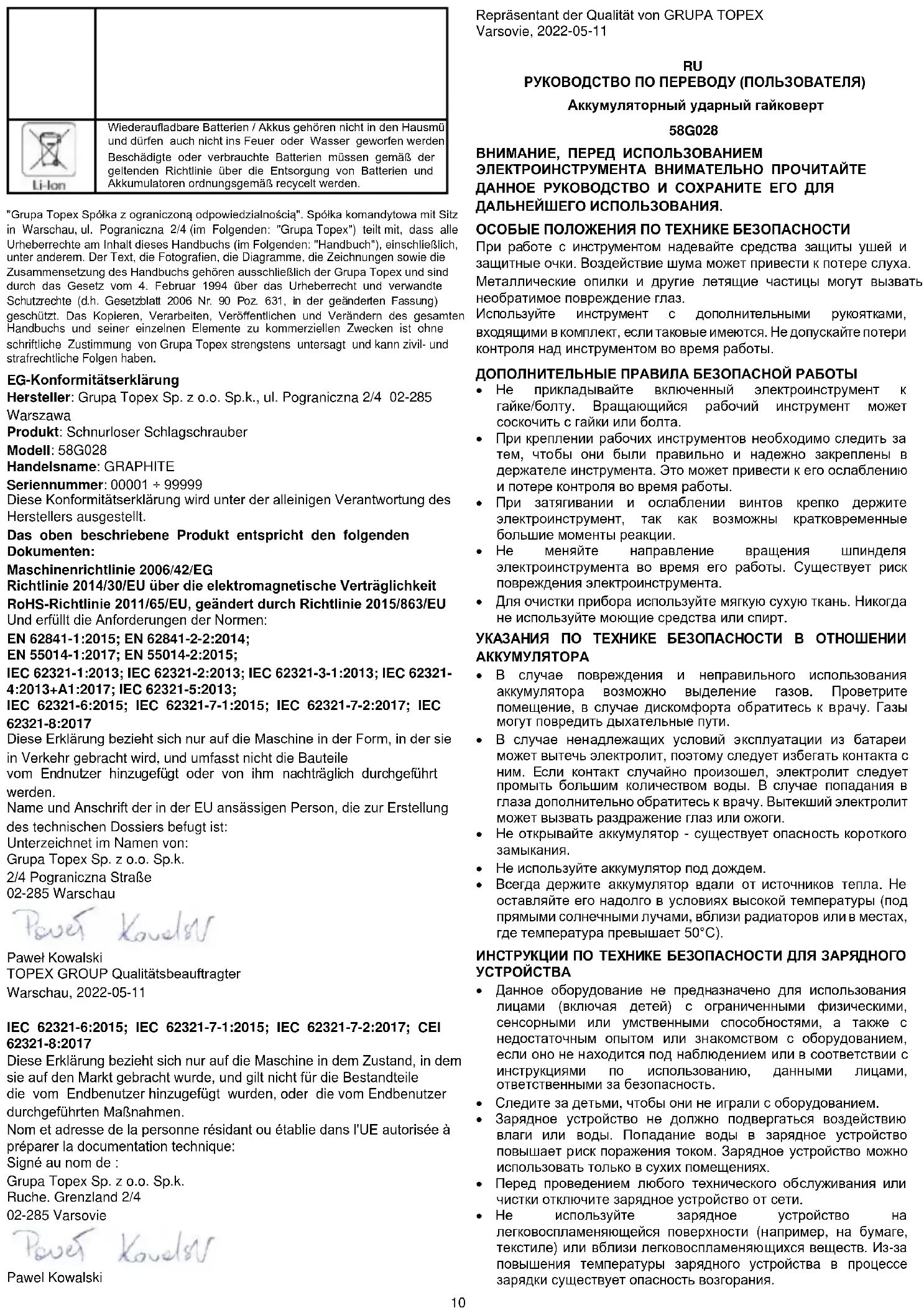 РУКОВОДСТВО ПО ПЕРЕВОДУ (ПОЛЬЗОВАТЕЛЯ) Аккумуляторный ударный гайковерт 58G028 ВНИМАНИЕ, ПЕРЕД ИСПОЛЬЗОВАНИЕМ ЭЛЕКТРОИНСТРУМЕНТА ВНИМАТЕЛЬНО ПРОЧИТАЙТЕ ДАННОЕ РУКОВОДСТВО И СОХРАНИТЕ ЕГО ДЛЯ ДАЛЬНЕЙШЕГО ИСПОЛЬЗОВАНИЯ. ОСОБЫЕ ПОЛОЖЕНИЯ ПО ТЕХНИКЕ БЕЗОПАСНОСТИ При работе с инструментом надевайте средства защиты ушей и защитные очки. Воздействие шума может привести к потере слуха. Металлические опилки и другие летящие частицы могут вызвать необратимое повреждение глаз. Используйте инструмент с дополнительными рукоятками, входящими в комплект, если таковые имеются. Не допускайте потери контроля над инструментом во время работы. ДОПОЛНИТЕЛЬНЫЕ ПРАВИЛА БЕЗОПАСНОЙ РАБОТЫ