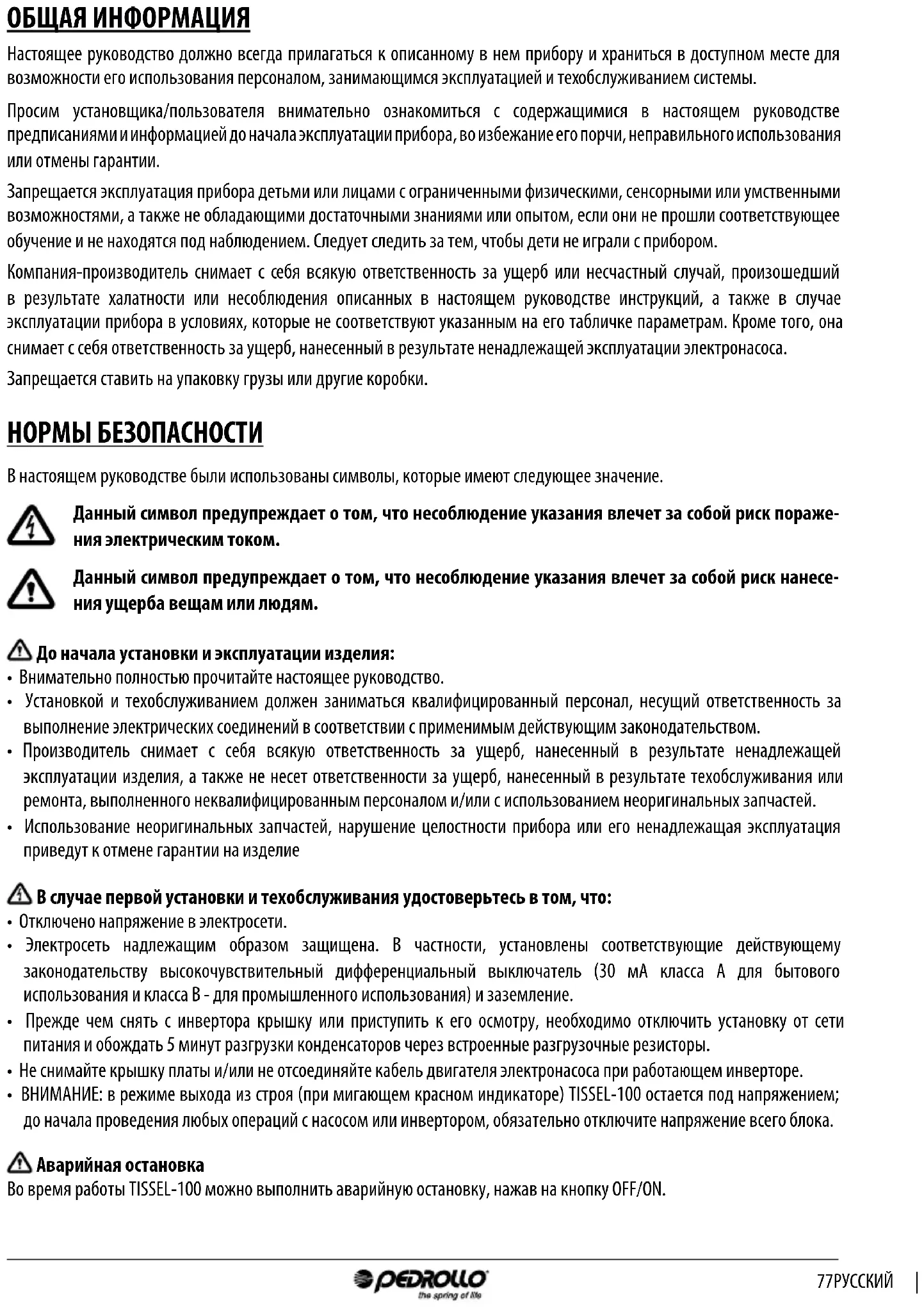 РУКОВОДСТВО ПОЛЬЗОВАТЕЛЯ TISSEL100 Pedrollo