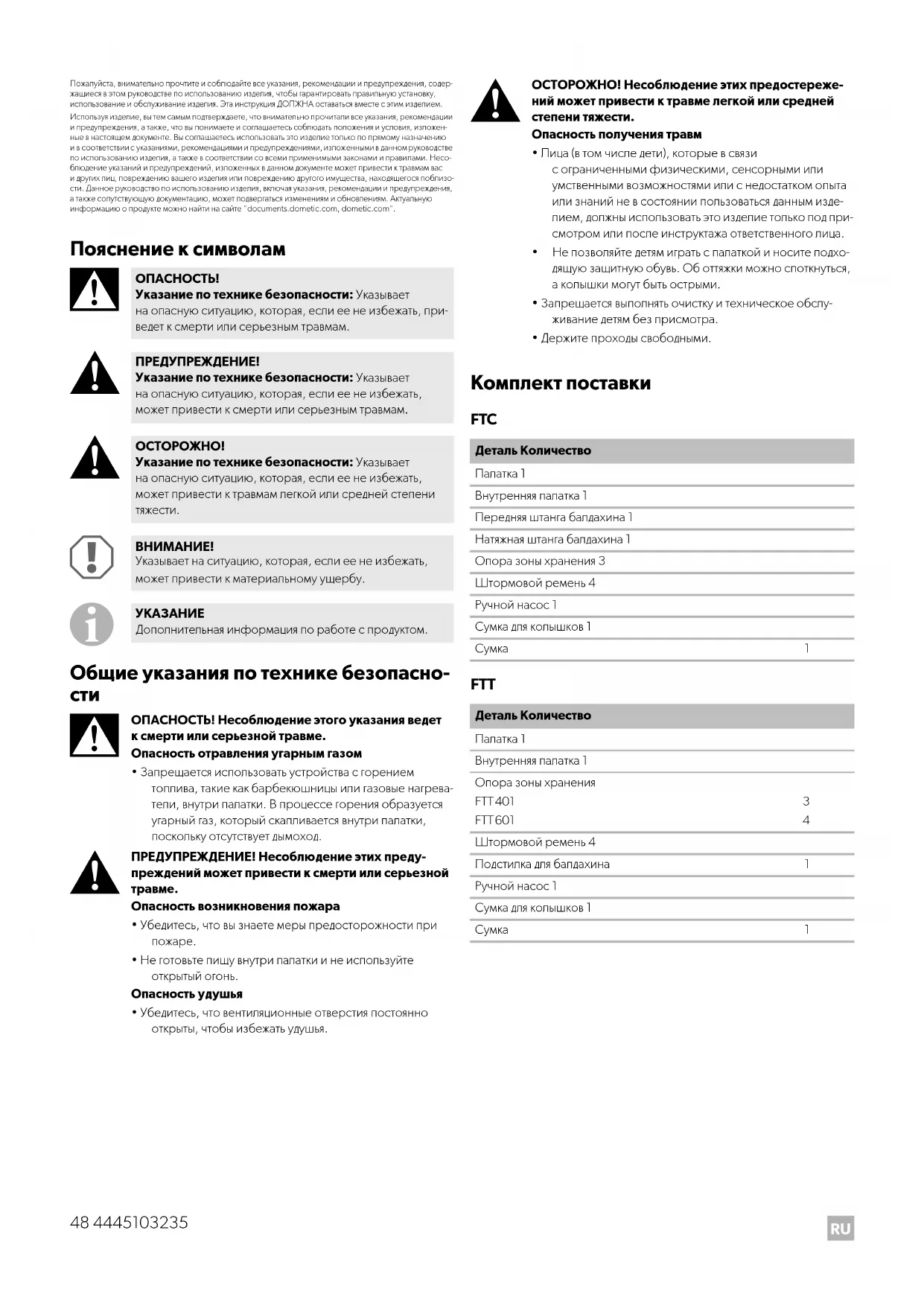 Штормовой ремень 4 Подстилка для балдахина 1 Ручной насос 1 Сумка для колышков 1 Сумка 1 DometicFTC-FTT-FTX_IOM_4445103235_EMEA16_20xx-xx-xx.book Seite 48 Montag, 22. November 2021 2:14 14RU