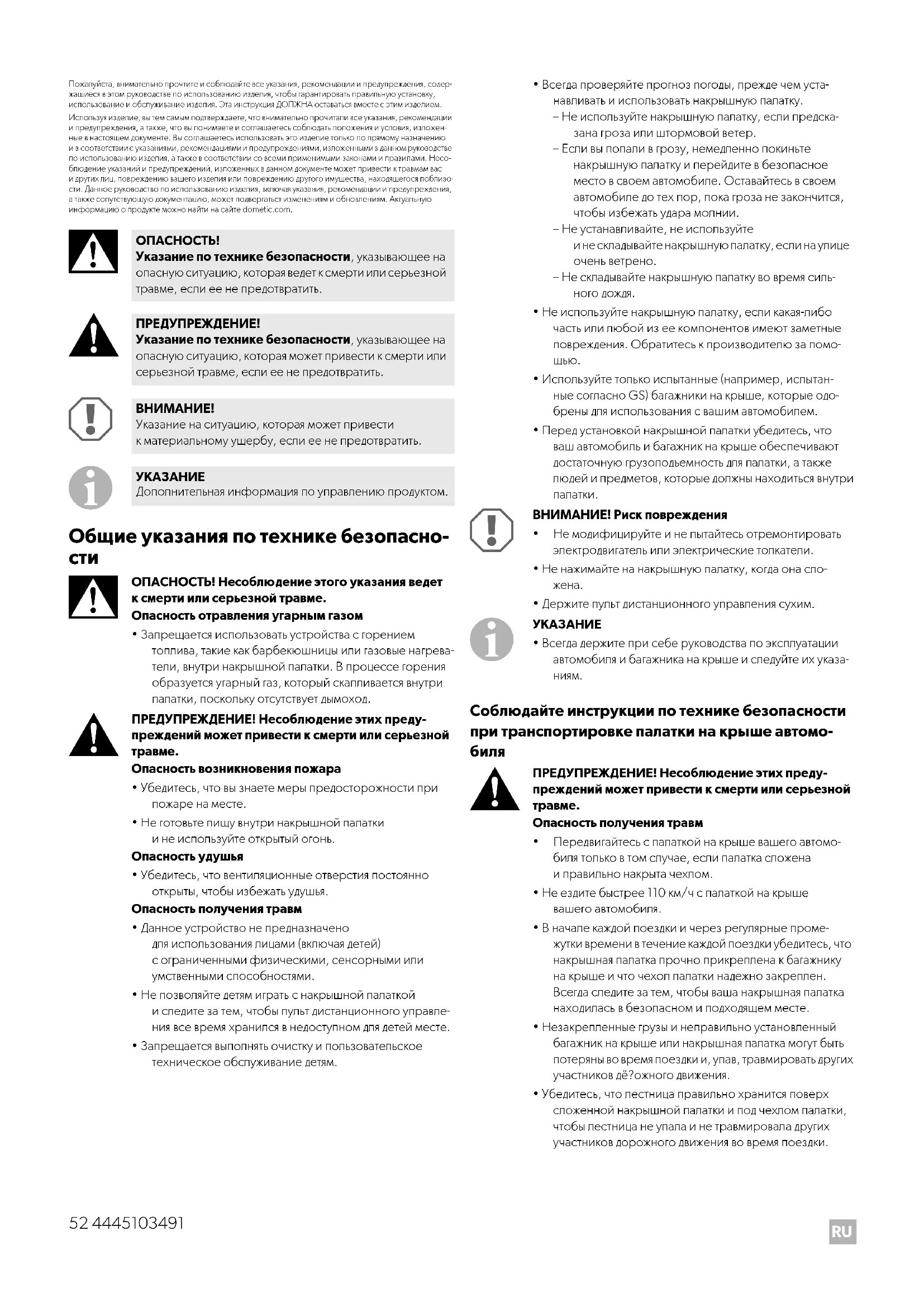 Пожалуйста, внимательно прочтите и соблюдайте все указания, рекомендации и предупреждения, содер- жащиеся в этом руководстве по использованию изделия, чтобы гарантировать правильную установку, использование и обслуживание изделия. Эта инструкция ДОЛЖНА оставаться вместе с этим изделием. Используя изделие, вы тем самым подтверждаете, что внимательно прочитали все указания, рекомендации и предупреждения, а также, что вы понимаете и соглашаетесь соблюдать положения и условия, изложен- ные в настоящем документе. Вы соглашаетесь использовать это изделие только по прямому назначению и в соответствии с указаниями, рекомендациями и предупреждениями, изложенными в данном руководстве по использованию изделия, а также в соответствии со всеми применимыми законами и правилами. Несо- блюдение указаний и предупреждений, изложенных в данном документе может привести к травмам вас и других лиц, повреждению вашего изделия или повреждению другого имущества, находящегося поблизо- сти. Данное руководство по использованию изделия, включая указания, рекомендации и предупреждения, а также сопутствующую документацию, может подвергаться изменениям и обновлениям. Актуальную информацию о продукте можно найти на сайте dometic.com.
