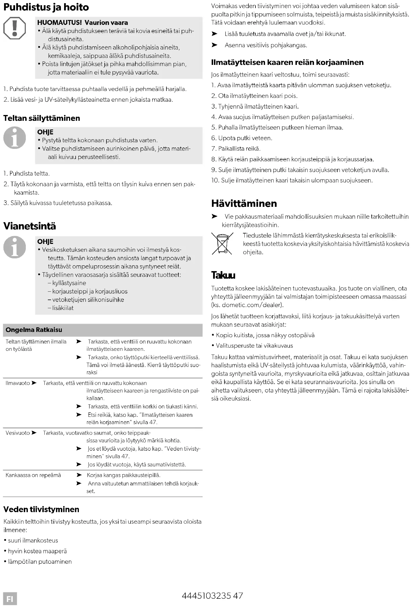 – водостойкое покрытие – ремонтную ленту и ремонтный комплект – силиконовый спрей для застежек-молний – запасные колышки Проблема Устранение Палатка надувается лишь струдом ➤ Убедитесь, что клапан полностью ввинчен в воздушную штангу. ➤ Проверьте, не перекручена ли трубка под- дува у клапана. На это может указывать шум. Раскрутите трубку поддува Утечка воздуха ➤ Убедитесь, что клапан полностью ввинчен в воздушную штангу, а кольцевое уплотнение находится на месте.➤ Убедитесь, что крышка клапана плотно закре-плена. ➤ Проверьте на отсутствие проколов, см. гл. «Ремонт прокола в воздушной штанге» на стр. 50. Протечка ➤ Проверьте наличие протекающих швов, поврежденных участков крепежных лент ивлажных зон. ➤ Если вам не удалось обнаружить протечку, см. гл. «Конденсат» на стр. 50.➤ При обнаружении протечек примените гер-метик. Разрыв ткани ➤ Используйте ремонтную ленту, чтобы уплот- нить ткань.➤ Ремонт должен быть выполнен авторизован-ным специалистом. DometicFTC-FTT-FTX_IOM_4445103235_EMEA16_20xx-xx-xx.book Seite 50 Montag, 22. November 2021 2:14 14RU