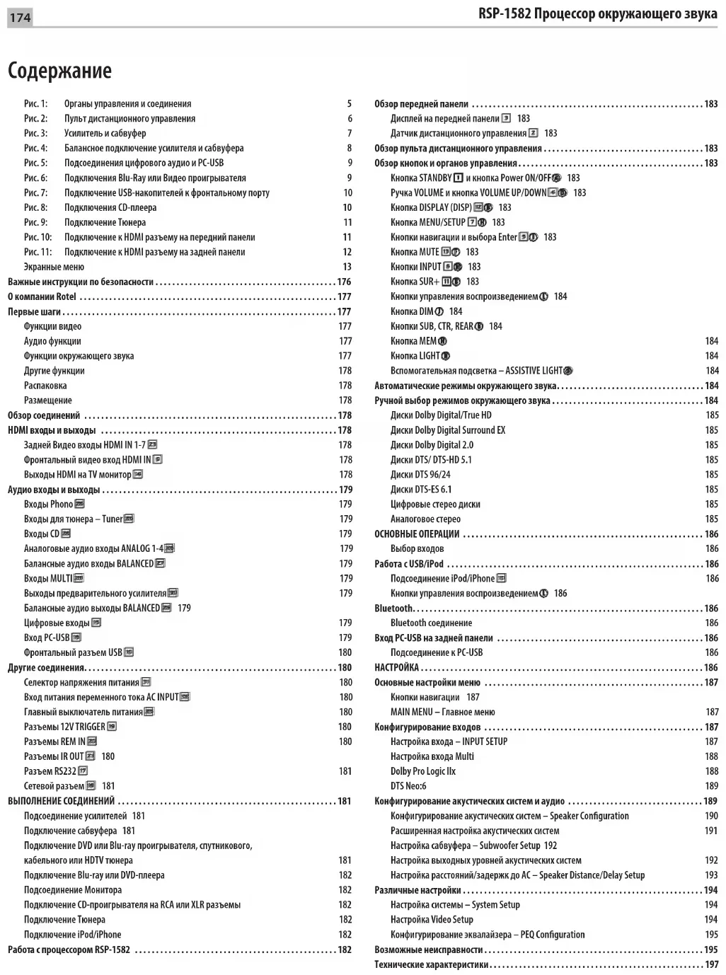 - Рис. 1: Органы управления и соединения 5 Рис. 2: Пульт дистанционного управления 6 Рис. 3: Усилитель и сабвуфер 7 Рис. 4: Балансное подключение усилителя и сабвуфера 8 Рис. 5: Подсоединения цифрового аудио и PC-USB 9 Рис. 6: Подключения Blu-Ray или Видео проигрывателя 9 Рис. 7: Подключение USB-накопителей к фронтальному порту 10 Рис. 8: Подключения CD-плеера 10 Рис. 9: Подключение Тюнера 11 Рис. 10: Подключение к HDMI разъему на передний панели 11 Рис. 11: Подключение к HDMI разъему на задней панели 12 Экранные меню 13 Важные инструкции по безопасности p. 176