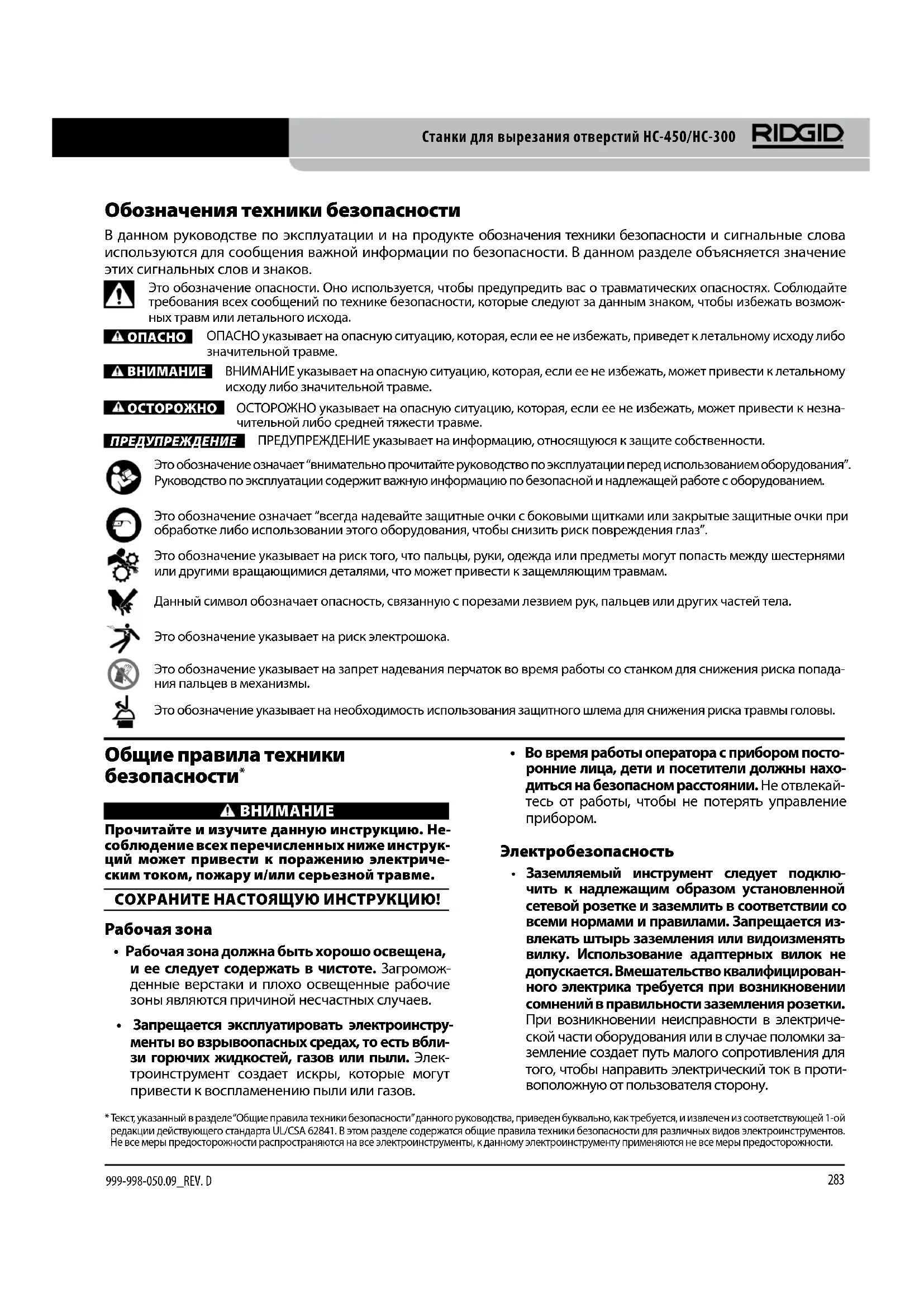 - Текст, указанный в разделе “Общие правила техники безопасности” данного руководства, приведен буквально, как требуется, и извлечен из соответствующей 1-ой редакции действующего стандарта UL/CSA 62841. В этом разделе содержатся общие правила техники безопасности для различных видов электроинструментов. Не все меры предосторожности распространяются на все электроинструменты, к данному электроинструменту применяются не все меры предосторожности.284 Станки для вырезания отверстий HC-450/HC-300