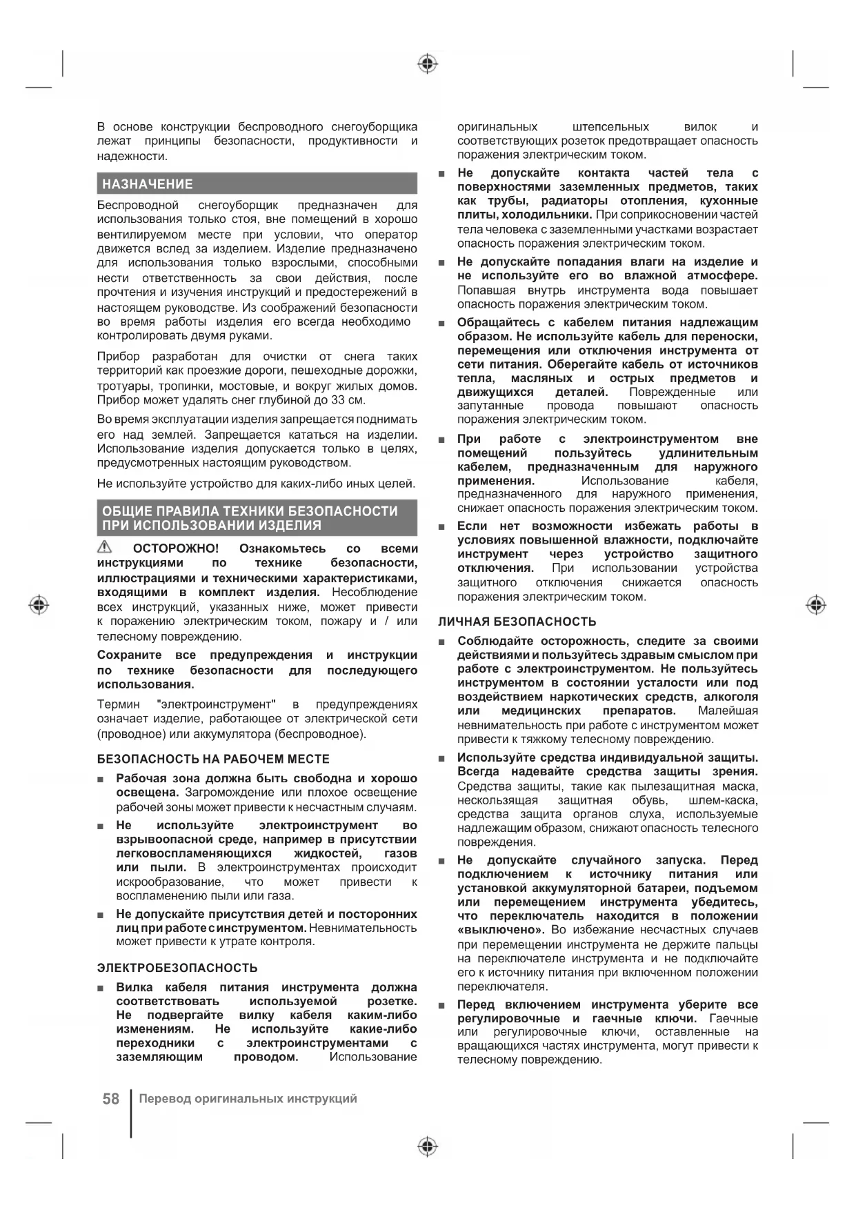 Беспроводной снегоуборщик предназначен для использования только стоя, вне помещений в хорошо вентилируемом месте при условии, что оператор движется вслед за изделием. Изделие предназначено для использования только взрослыми, способными нести ответственность за свои действия, после прочтения и изучения инструкций и предостережений в настоящем руководстве. Из соображений безопасности во время работы изделия его всегда необходимо контролировать двумя руками. Прибор разработан для очистки от снега таких территорий как проезжие дороги, пешеходные дорожки, тротуары, тропинки, мостовые, и вокруг жилых домов. Прибор может удалять снег глубиной до 33 см. Во время эксплуатации изделия запрещается поднимать его над землей. Запрещается кататься на изделии. Использование изделия допускается только в целях, предусмотренных настоящим руководством. Не используйте устройство для каких-либо иных целей. ОБЩИЕ ПРАВИЛА ТЕХНИКИ БЕЗОПАСНОСТИ ПРИ ИСПОЛЬЗОВАНИИ ИЗДЕЛИЯ ОСТОРОЖНО! Ознакомьтесь со всеми инструкциями по технике безопасности, иллюстрациями и техническими характеристиками, входящими в комплект изделия. Несоблюдение всех инструкций, указанных ниже, может привести к поражению электрическим током, пожару и / или телесному повреждению. Сохраните все предупреждения и инструкции по технике безопасности для последующего использования. Термин "электроинструмент" в предупреждениях означает изделие, работающее от электрической сети (проводное) или аккумулятора (беспроводное). БЕЗОПАСНОСТЬ НА РАБОЧЕМ МЕСТЕ ■ Рабочая зона должна быть свободна и хорошо освещена. Загромождение или плохое освещение рабочей зоны может привести к несчастным случаям. ■ Не используйте электроинструмент во взрывоопасной среде, например в присутствии легковоспламеняющихся жидкостей, газов или пыли. В электроинструментах происходит искрообразование, что может привести к воспламенению пыли или газа. ■ Не допускайте присутствия детей и посторонних лиц при работе с инструментом. Невнимательность может привести к утрате контроля. ЭЛЕКТРОБЕЗОПАСНОСТЬ ■ Вилка кабеля питания инструмента должна соответствовать используемой розетке. Не подвергайте вилку кабеля каким-либо изменениям. Не используйте какие-либо переходники с электроинструментами с заземляющим проводом. Использование оригинальных штепсельных вилок и соответствующих розеток предотвращает опасность поражения электрическим током. ■ Не допускайте контакта частей тела с поверхностями заземленных предметов, таких как трубы, радиаторы отопления, кухонные плиты, холодильники. При соприкосновении частей тела человека с заземленными участками возрастает опасность поражения электрическим током. ■ Не допускайте попадания влаги на изделие и не используйте его во влажной атмосфере. Попавшая внутрь инструмента вода повышает опасность поражения электрическим током. ■ Обращайтесь с кабелем питания надлежащим образом. Не используйте кабель для переноски, перемещения или отключения инструмента от сети питания. Оберегайте кабель от источников тепла, масляных и острых предметов и движущихся деталей. Поврежденные или запутанные провода повышают опасность поражения электрическим током. ■ При работе с электроинструментом вне помещений пользуйтесь удлинительным кабелем, предназначенным дл