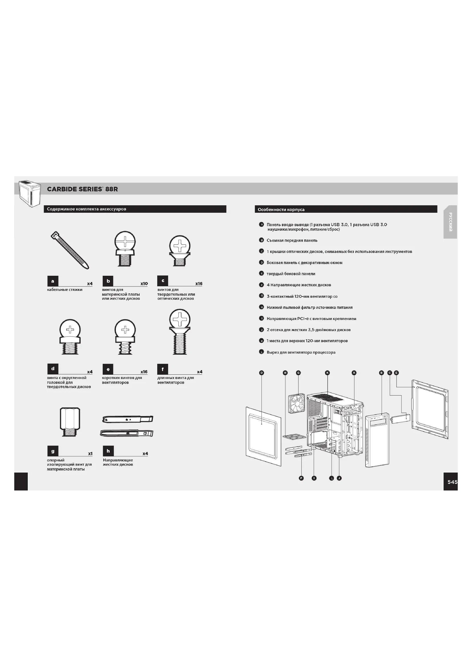 твердотельных или оптических дисков Панель ввода-вывода (1 разъема USB 3.0, 1 разъема USB 3.0 наушники/микрофон, питание/сброс) Съемная передняя панель 1 крышки оптических дисков, снимаемых без использования инструментов Боковая панель с декоративным окном твердый боковой панели 4 Направляющие жестких дисков 3-контактный 120-мм вентилятор со Нижний пылевой фильтр источника питания Направляющая PCI-e с винтовым креплением 2 отсека для жестких 3,5-дюймовых дисков 1 места для верхних 120-мм вентиляторов Вырез для вентилятора процессора