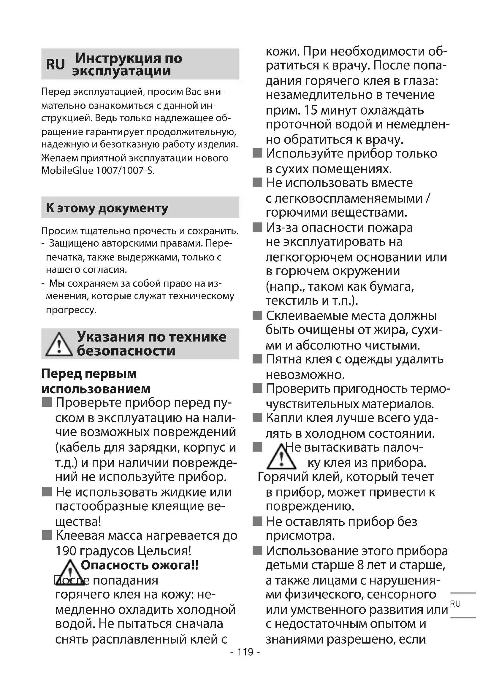 Инструкция по эксплуатации Перед эксплуатацией, просим Вас вни- мательно ознакомиться с данной ин- струкцией. Ведь только надлежащее об- ращение гарантирует продолжительную, надежную и безотказную работу изделия. Желаем приятной эксплуатации нового MobileGlue 1007/1007-S. К этому документу Просим тщательно прочесть и сохранить. - Защищено авторскими правами. Пере- печатка, также выдержками, только с нашего согласия. - Мы сохраняем за собой право на из- менения, которые служат техническому